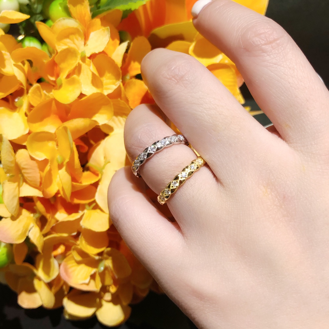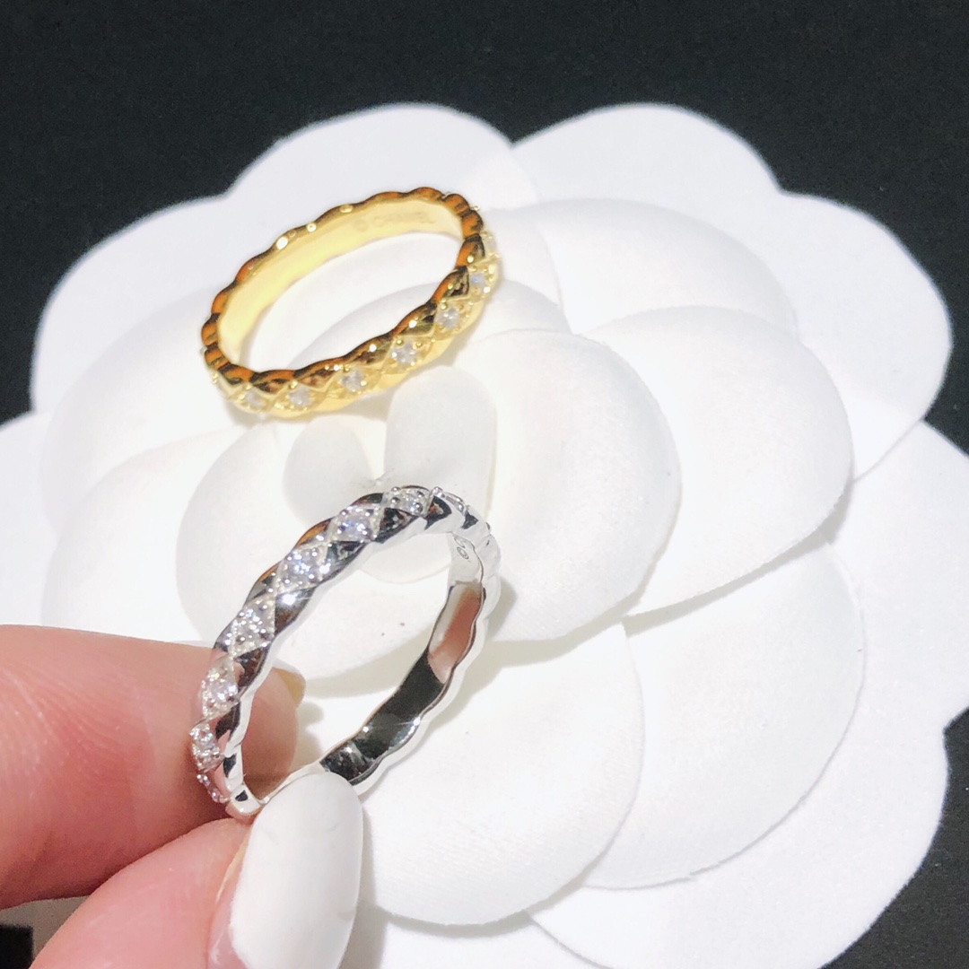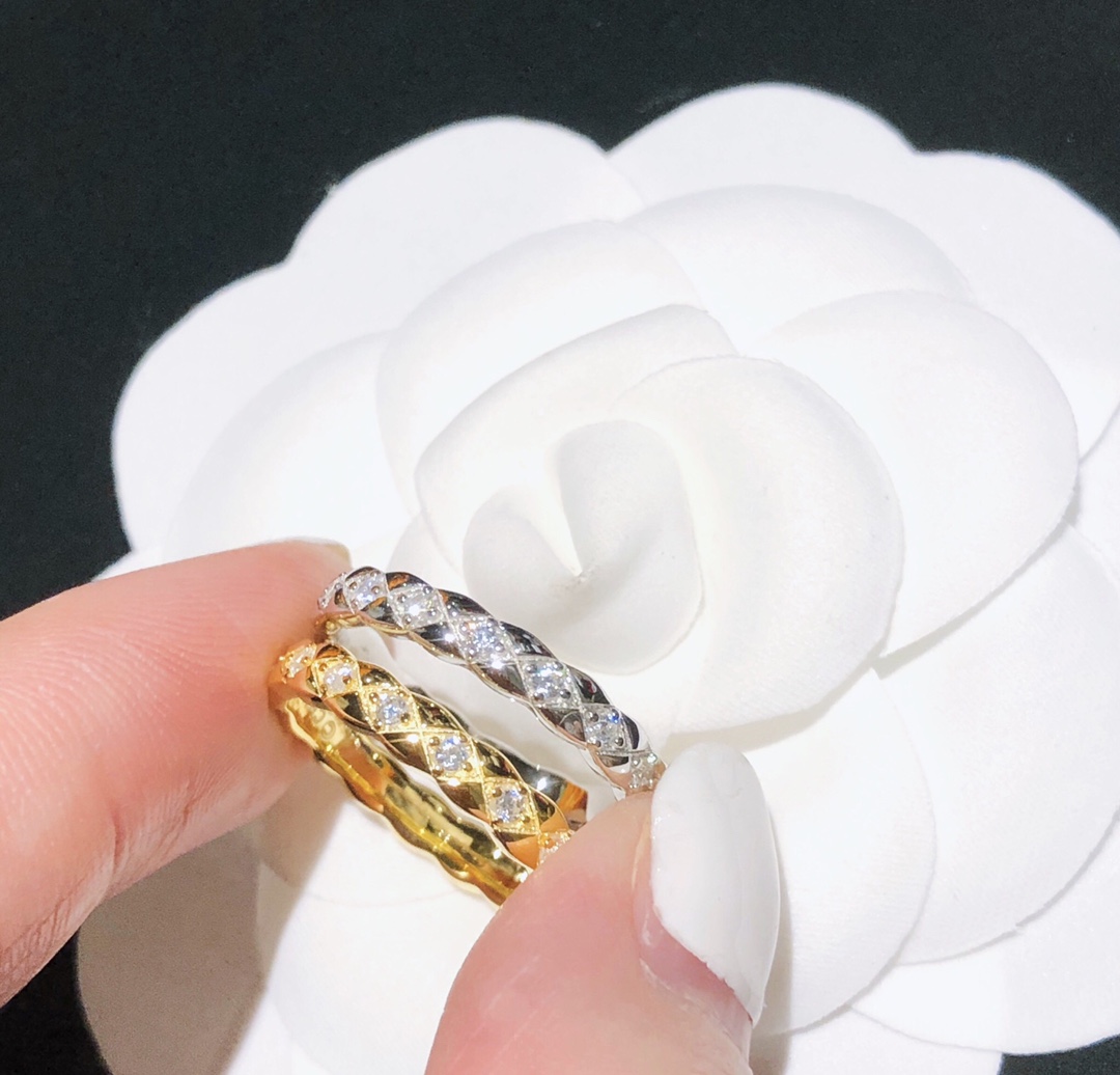 xx798 明星最愛的最窄版香奈兒 小香 戒指。永恆經典的香奈兒菱格紋戒指圖案,高端925純銀厚金電鍍層 Au 750 18k工藝 專櫃對版 打造令人心動的#COCOCRUSH#高級珠寶系列,讓你隨心混搭。全新菱格紋既可單獨佩戴,亦可與系列戒指、每種組合都令你不同凡響。碼數6 7 8號齊全 白金黃金