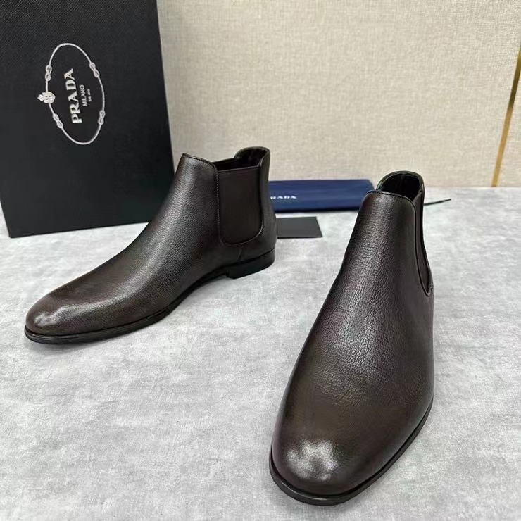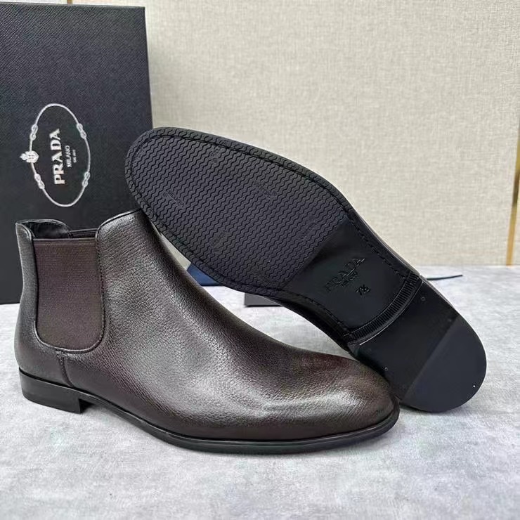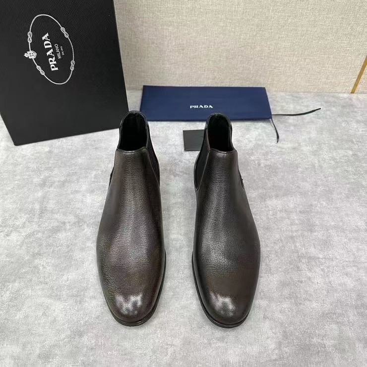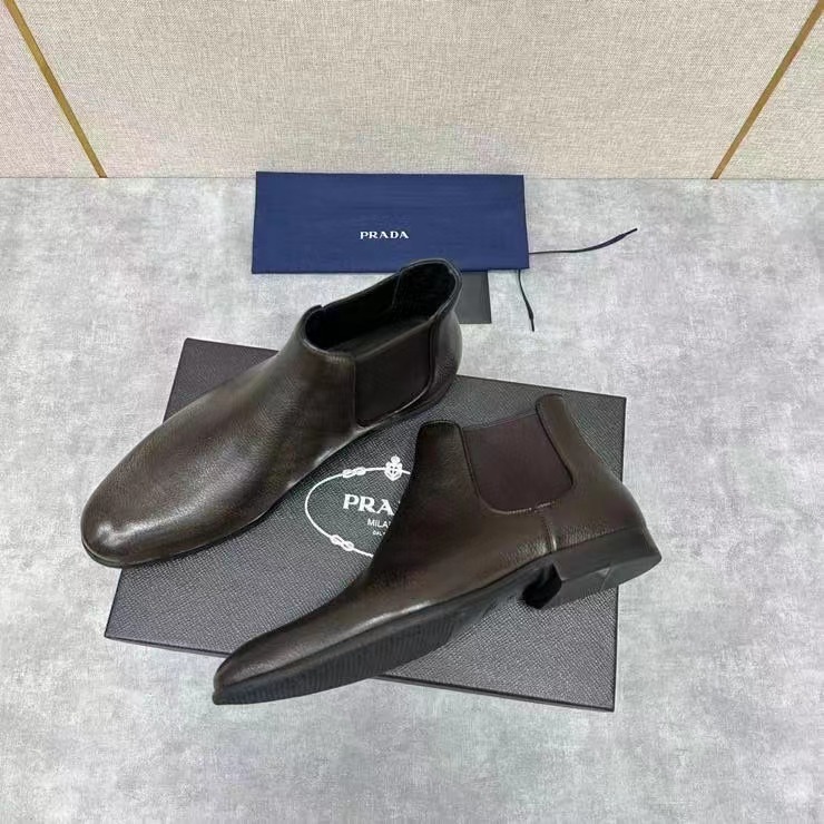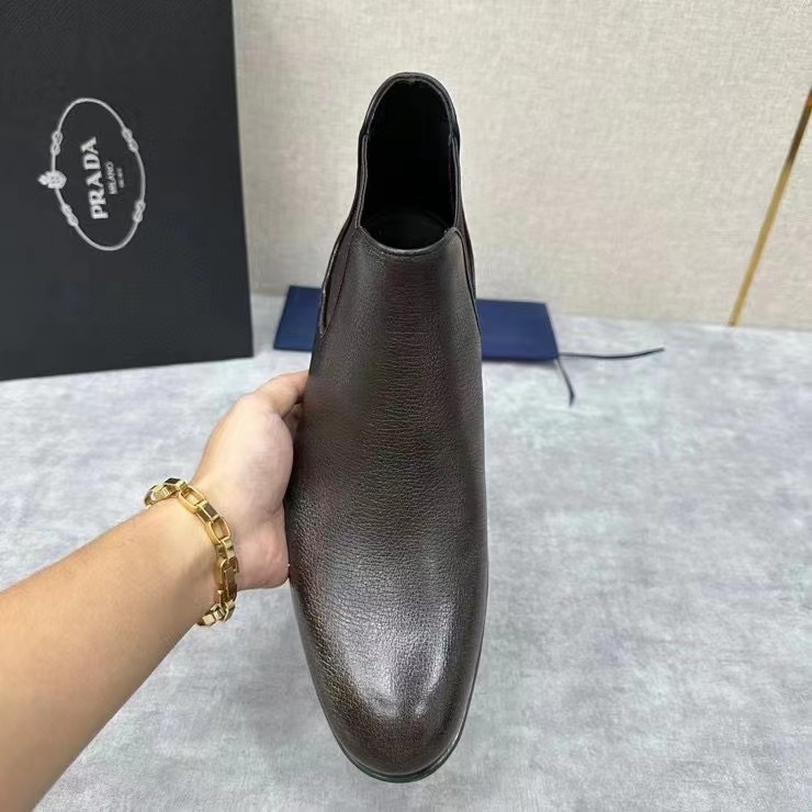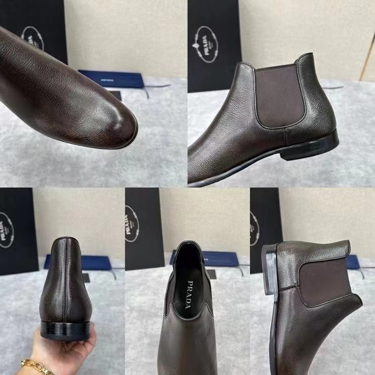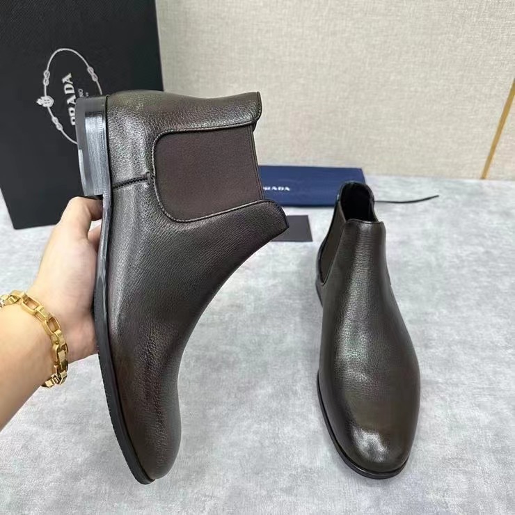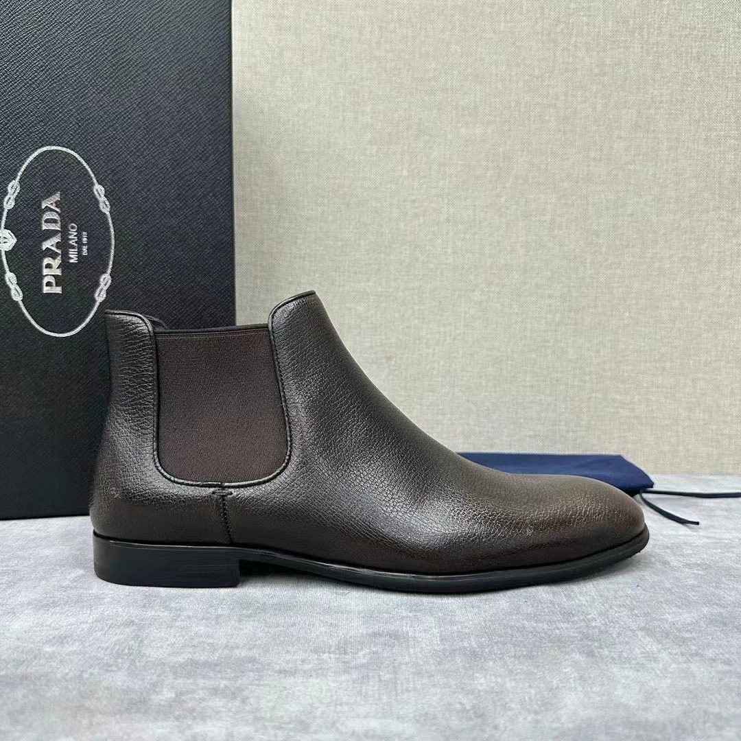 💋💍P家 新品Saffiano皮革切爾西短靴🔥 最新官方秀場壓軸款式 采用錐形廓形,側面配有特色松緊布,盡顯精致時尚,現代氣息十足 精選優勢摔紋小牛皮 超軟細膩 內裏本染小牛皮 標配P家銀標墊腳 皮質鞋底前掌帶防滑Vibraw 橡膠。舒適度極好 強烈推薦 偏英倫薄底帥氣版型 男神專屬殺器 男人鞋櫃標配精品 配原盒包裝 標準皮鞋碼數:38~44
