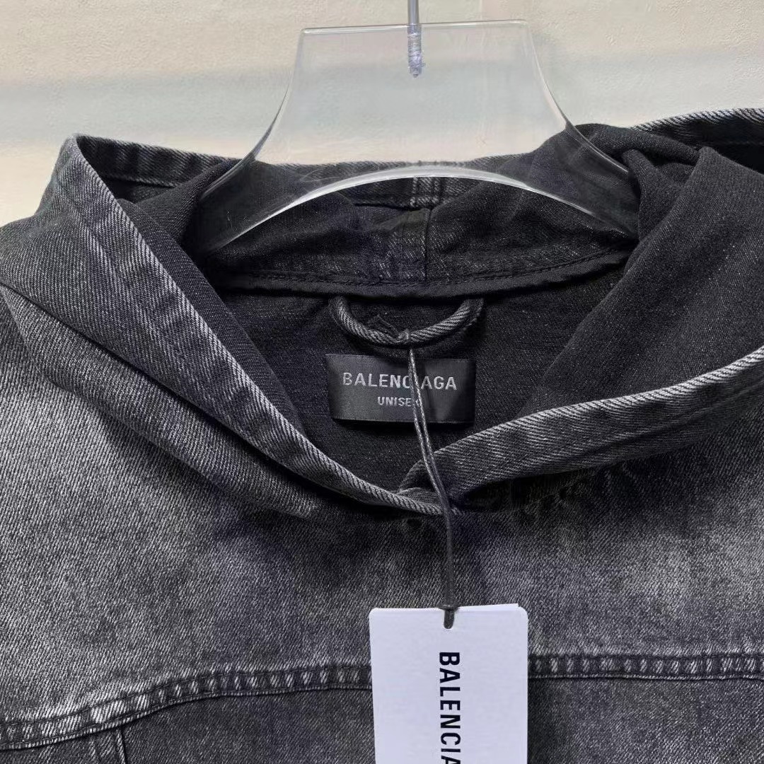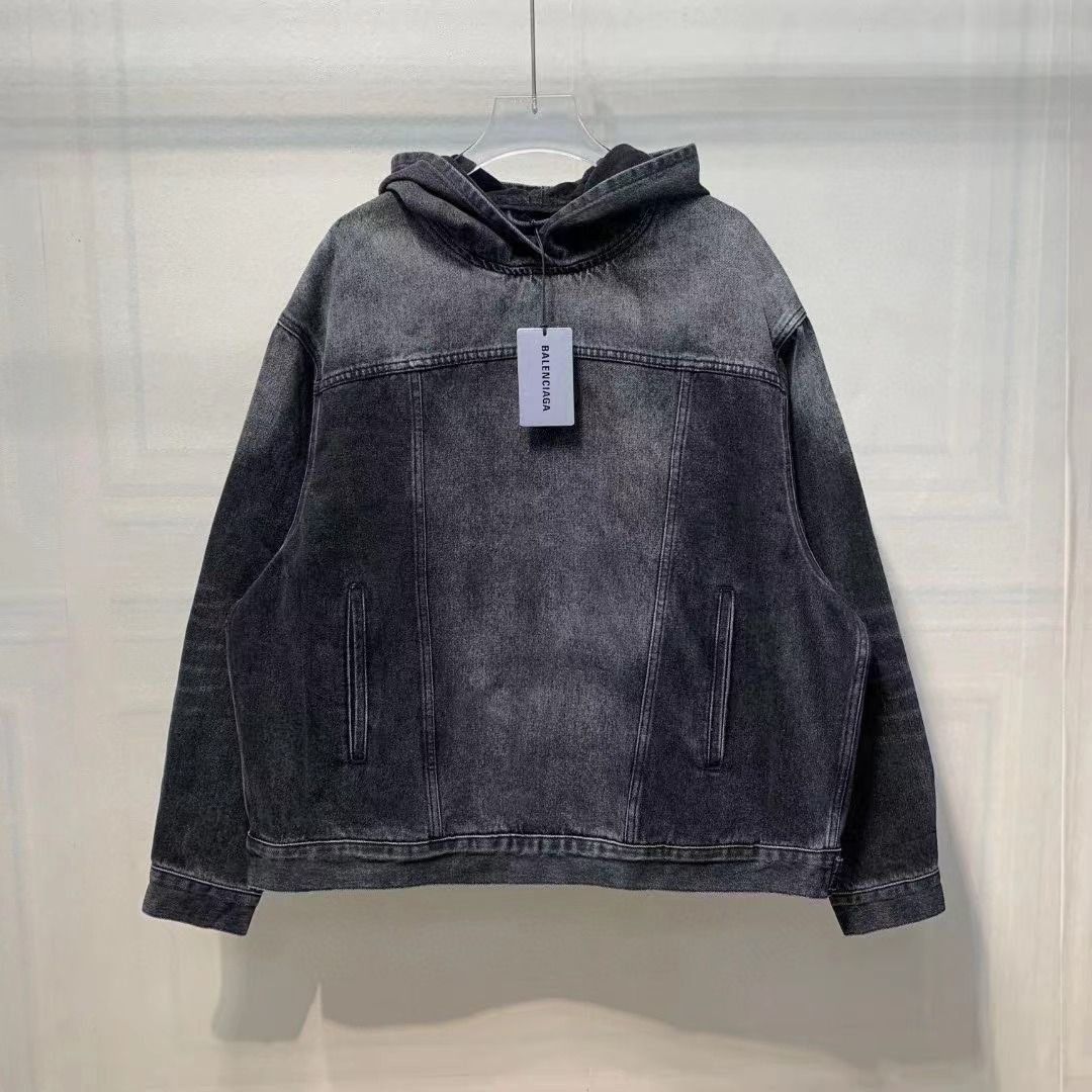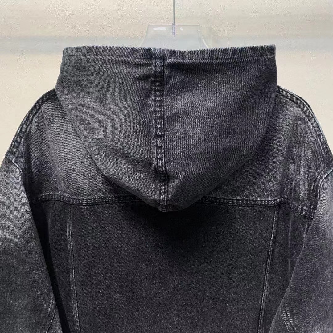 H68020 BL-寬松連帽牛仔衛衣 ,硫化黑面料,衛衣款連帽衫牛仔板型,酵漂懷舊,多位磨破,噴多位馬騮,定製五金!GW同款