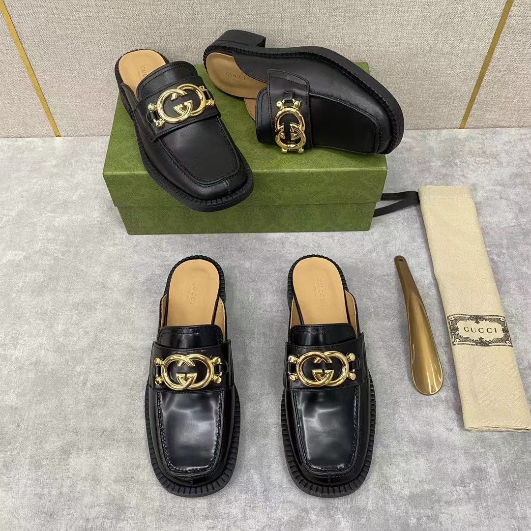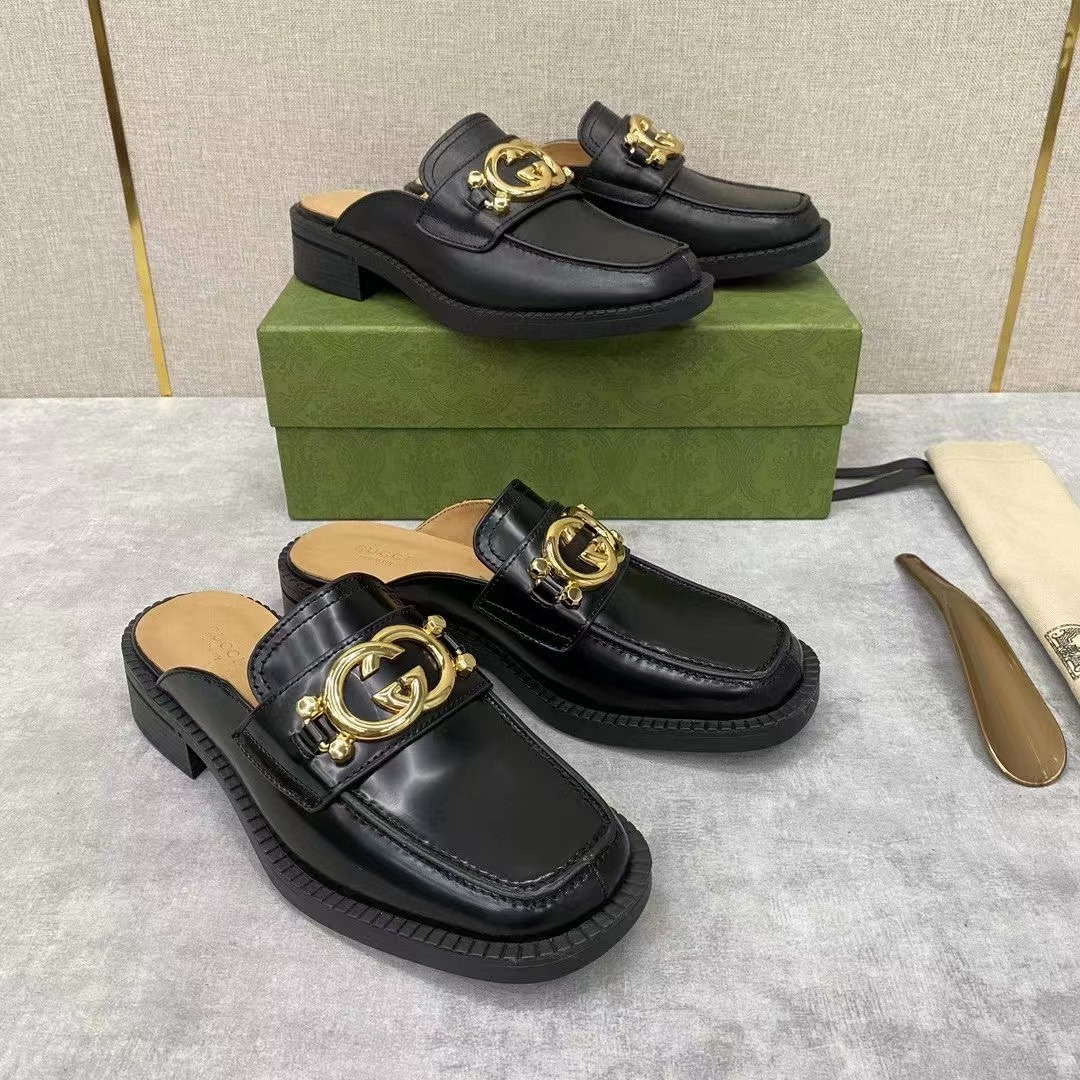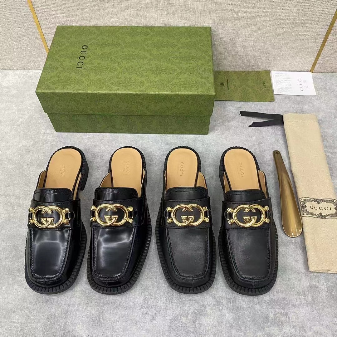 💋💍G家新品情侶款💑 官網新款穆勒鞋半拖 互扣式雙G拖鞋 官方售價RMB¥7,200 采用進口啞光牛皮/開邊珠亮皮製作 鞋面飾釘互扣式雙G 金色logo大扣 內裏水染牛皮打造 Gucc*o Gucc* 於1921年創立品牌。他的姓名首字母通過不同表現手法貫穿各個系列,以此致敬這份寶貴的饋贈 是一款標誌性單品和經典配飾,賦予設計靈動氣質。原版橡膠厚底 整體廓形運用黑色皮革煥新演繹,並飾以輪廓分明的鞋跟和Gucc*o Gucc* 先生的字母交織圖案。 這款黑色皮革拖鞋運用金色調互扣式雙G配件生動詮釋這一主題。展現對Gucc*傳統的現代象征和真切致敬