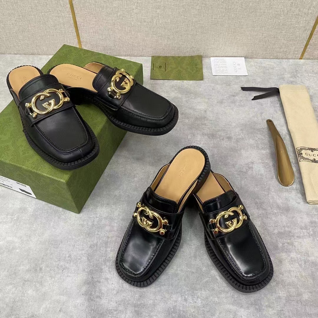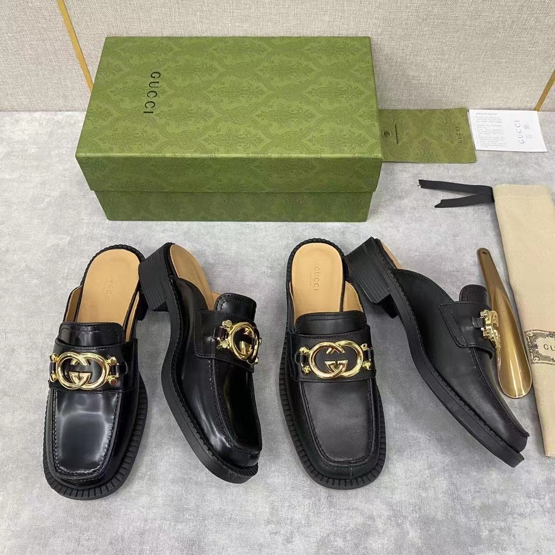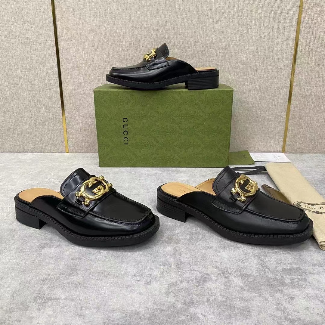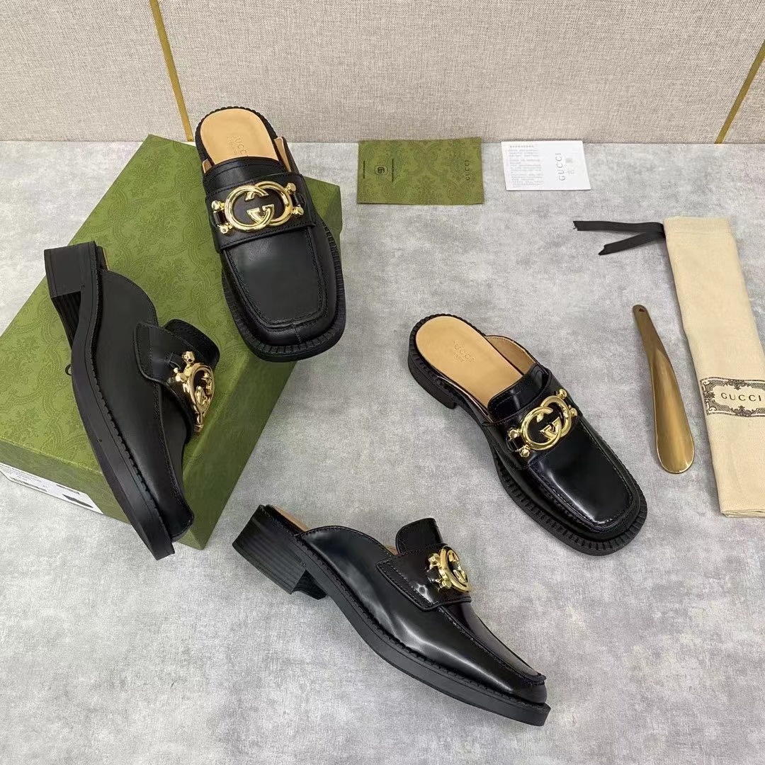 💋💍G家新品情侶款💑 官網新款穆勒鞋半拖 互扣式雙G拖鞋 官方售價RMB¥7,200 采用進口啞光牛皮/開邊珠亮皮製作 鞋面飾釘互扣式雙G 金色logo大扣 內裏水染牛皮打造 Gucc*o Gucc* 於1921年創立品牌。他的姓名首字母通過不同表現手法貫穿各個系列,以此致敬這份寶貴的饋贈 是一款標誌性單品和經典配飾,賦予設計靈動氣質。原版橡膠厚底 整體廓形運用黑色皮革煥新演繹,並飾以輪廓分明的鞋跟和Gucc*o Gucc* 先生的字母交織圖案。 這款黑色皮革拖鞋運用金色調互扣式雙G配件生動詮釋這一主題。展現對Gucc*傳統的現代象征和真切致敬