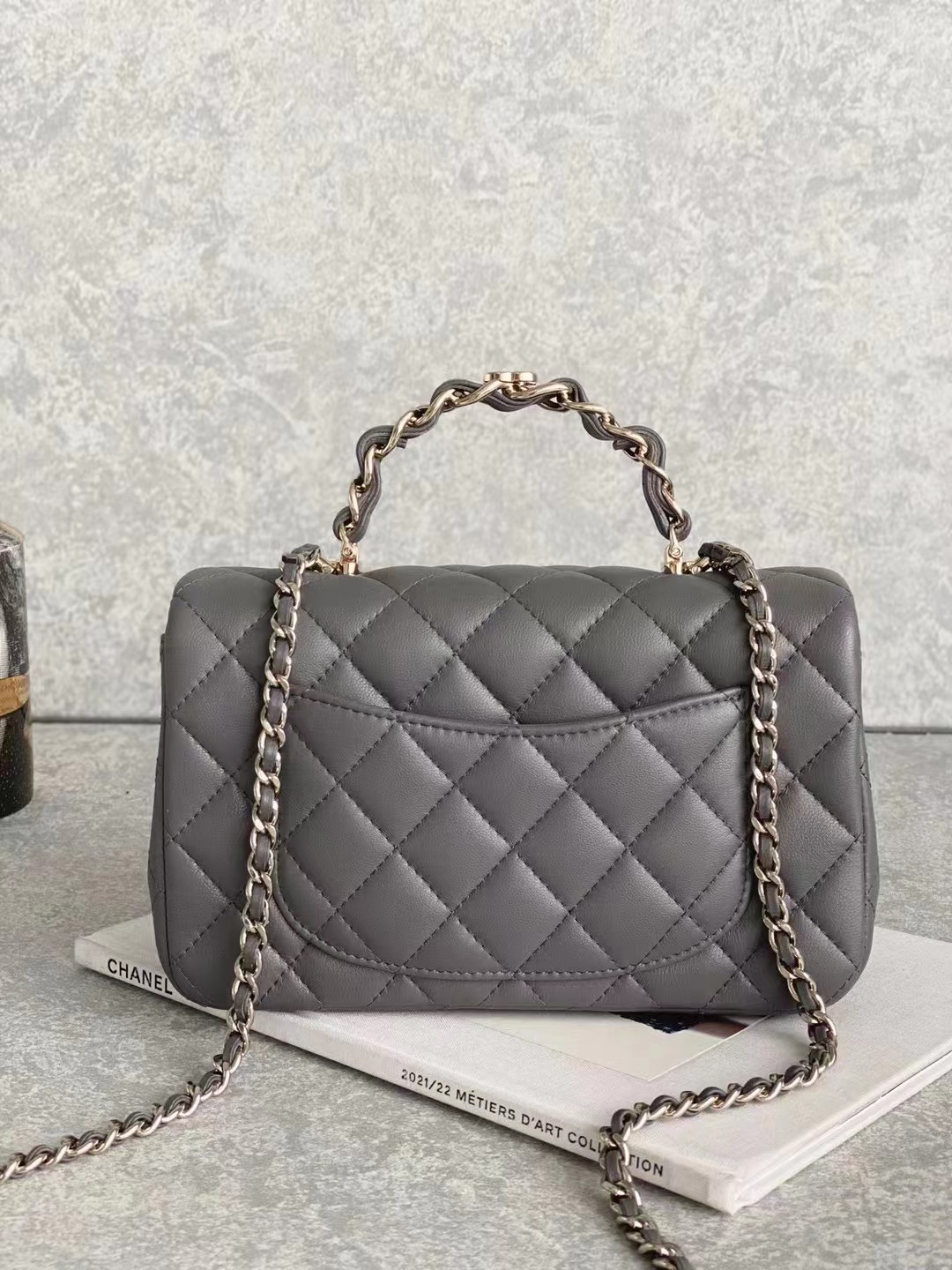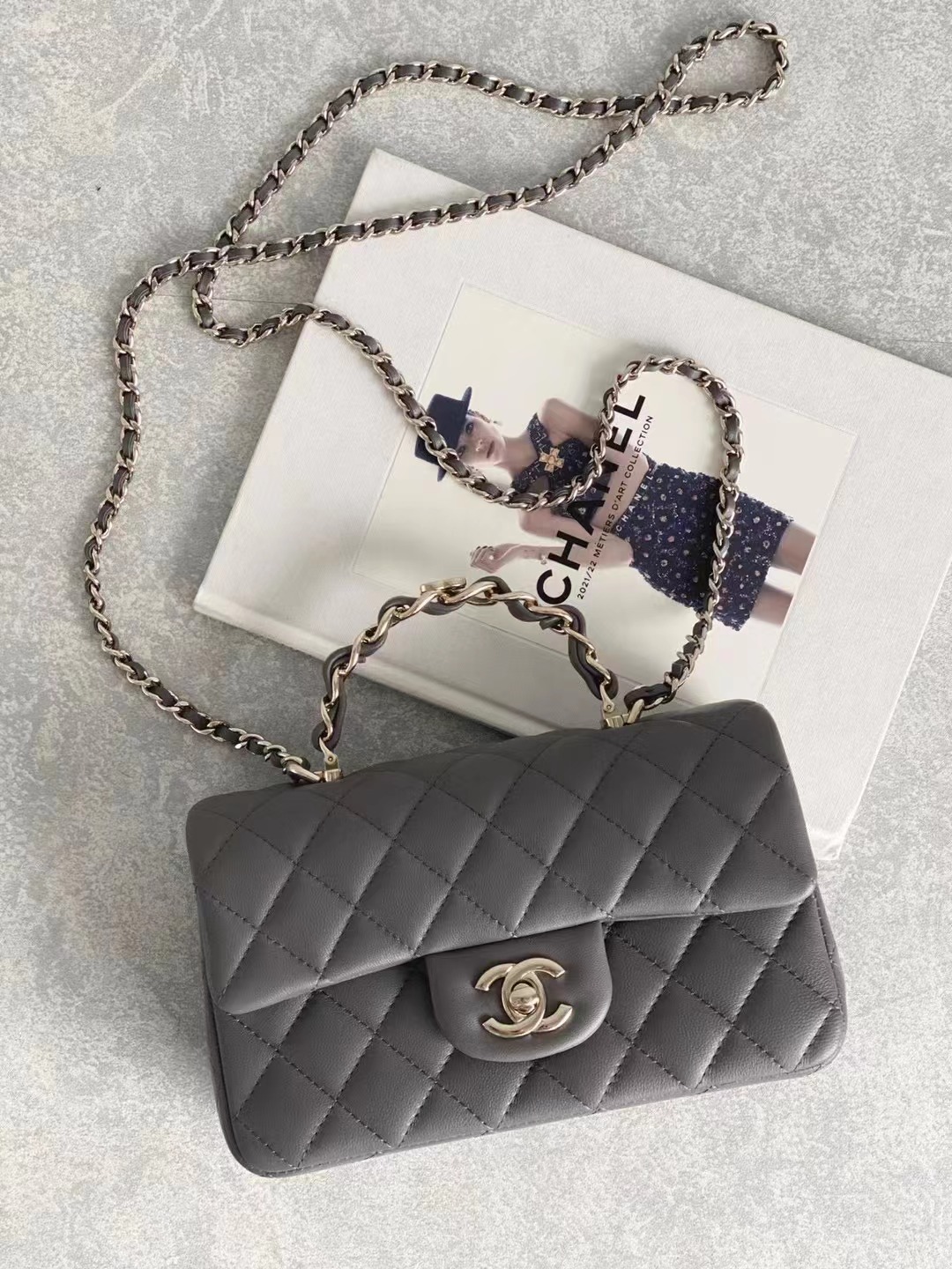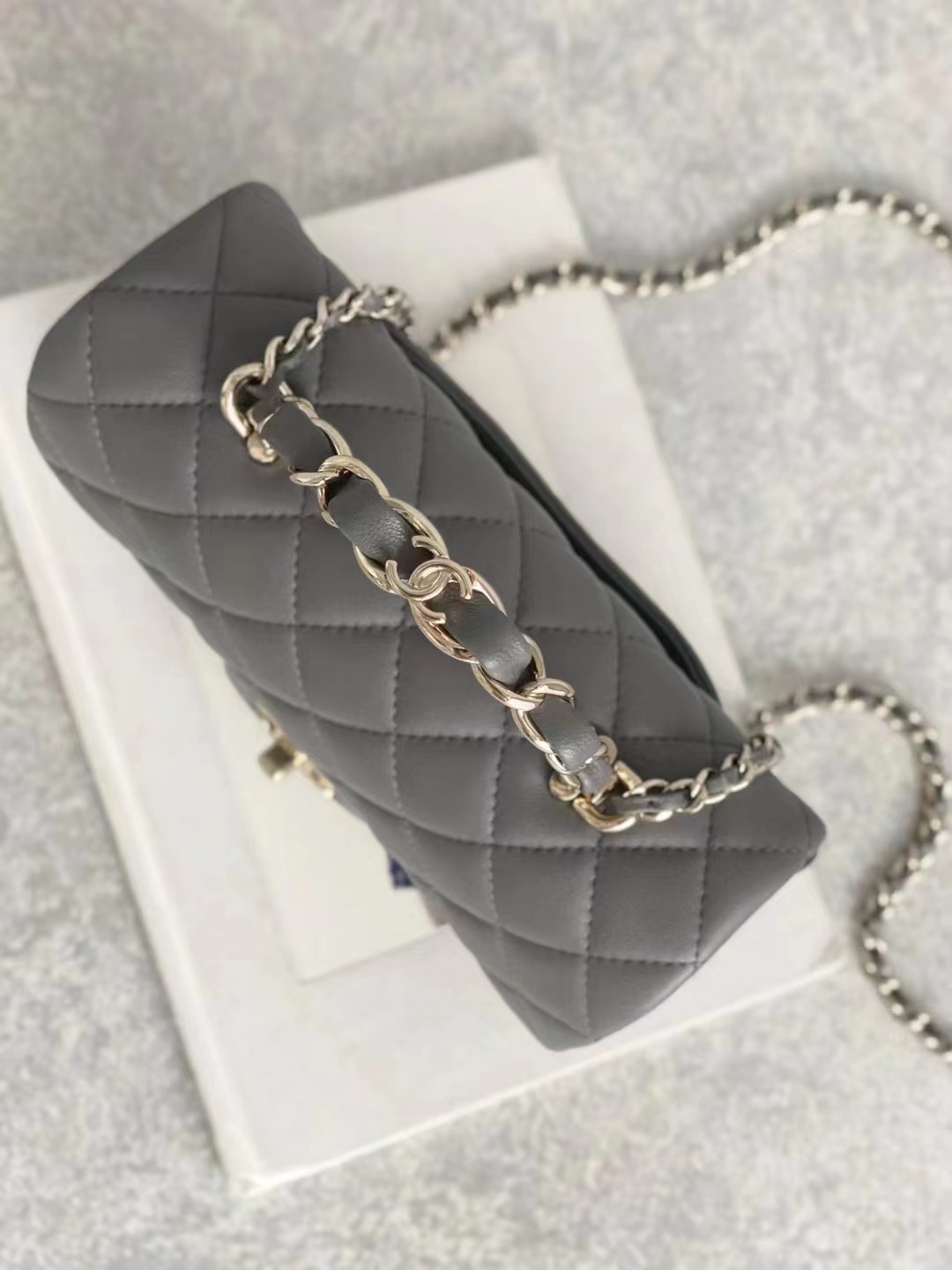 2023 手柄Mini CF Handle 手柄款cf款式一直以來都是百看不膩的 23K這季度在經典cf handle基礎上搭配了皮穿鏈手柄 經典minicf的大小,容量感人,pro max粉餅口紅鑰匙都能放得下 淺金扣雙C五金,菱格紋飽滿,鏈條長度也合適 手柄很精致,中間帶有一個經典的雙C小logo,感覺有點小俏皮 NO.2080881