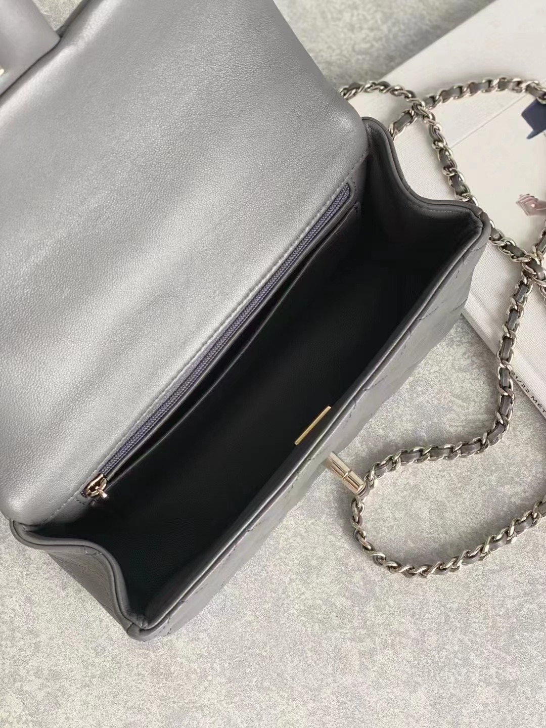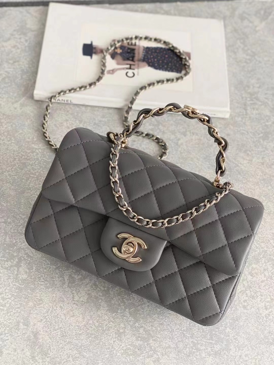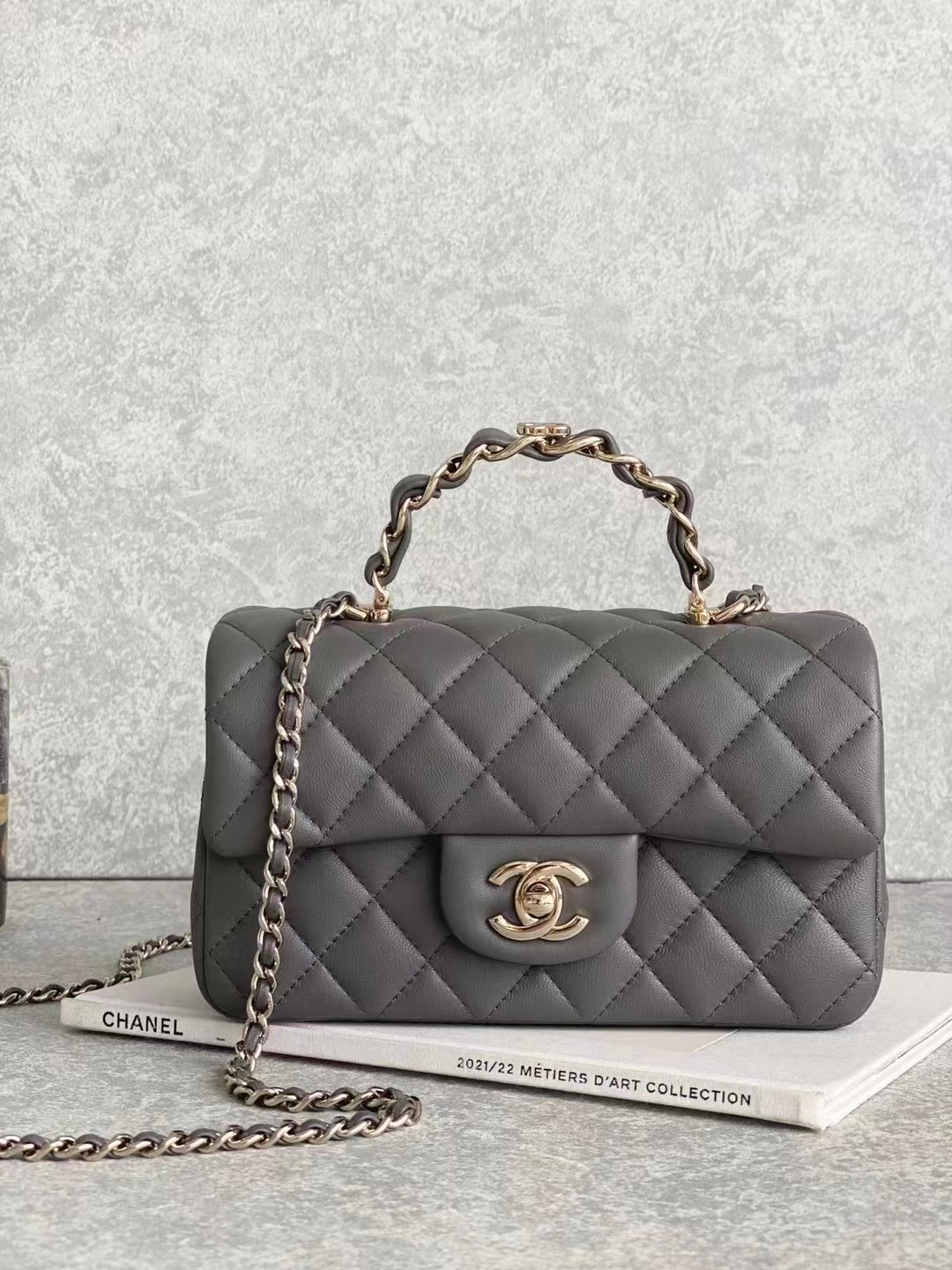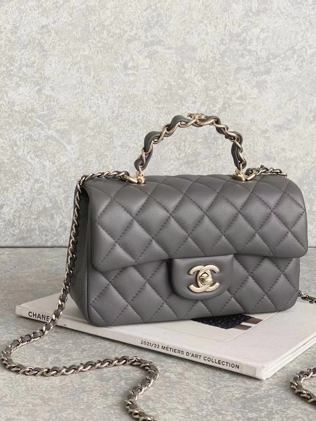 2023 手柄Mini CF Handle 手柄款cf款式一直以來都是百看不膩的 23K這季度在經典cf handle基礎上搭配了皮穿鏈手柄 經典minicf的大小,容量感人,pro max粉餅口紅鑰匙都能放得下 淺金扣雙C五金,菱格紋飽滿,鏈條長度也合適 手柄很精致,中間帶有一個經典的雙C小logo,感覺有點小俏皮 NO.2080881