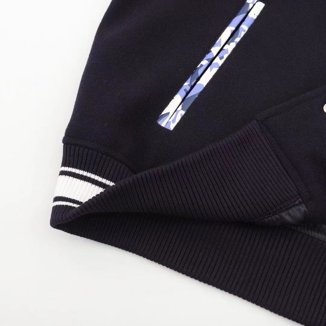 渠道精品 潮男潮女ZUI愛的棒球服夾克,市場各級版本都有(細節你們一定要對比),最牛X的實力品控 生產研究棒球服7個年頭 細節精致。擁有它,你就是全宇宙的最靚的仔.烤漆面全平面四合扣(紐扣帶LOGO),面料克重平均近900克,采用羊毛+睛綸混紡 定織定染的羊毛呢 擁有較高的色牢度。內襯是絲滑細膩的銅氨纖維材質!質感厚實,色澤更為均勻靚麗,棱角分明立體感十足彰顯慵懶隨性,年輕活力!