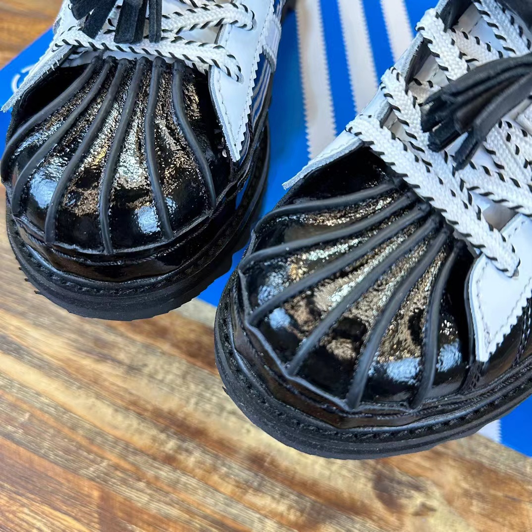 配有白色皮革鞋身,飾有透氣孔以增強透氣性,並輔以標志性的貝殼鞋頭,
