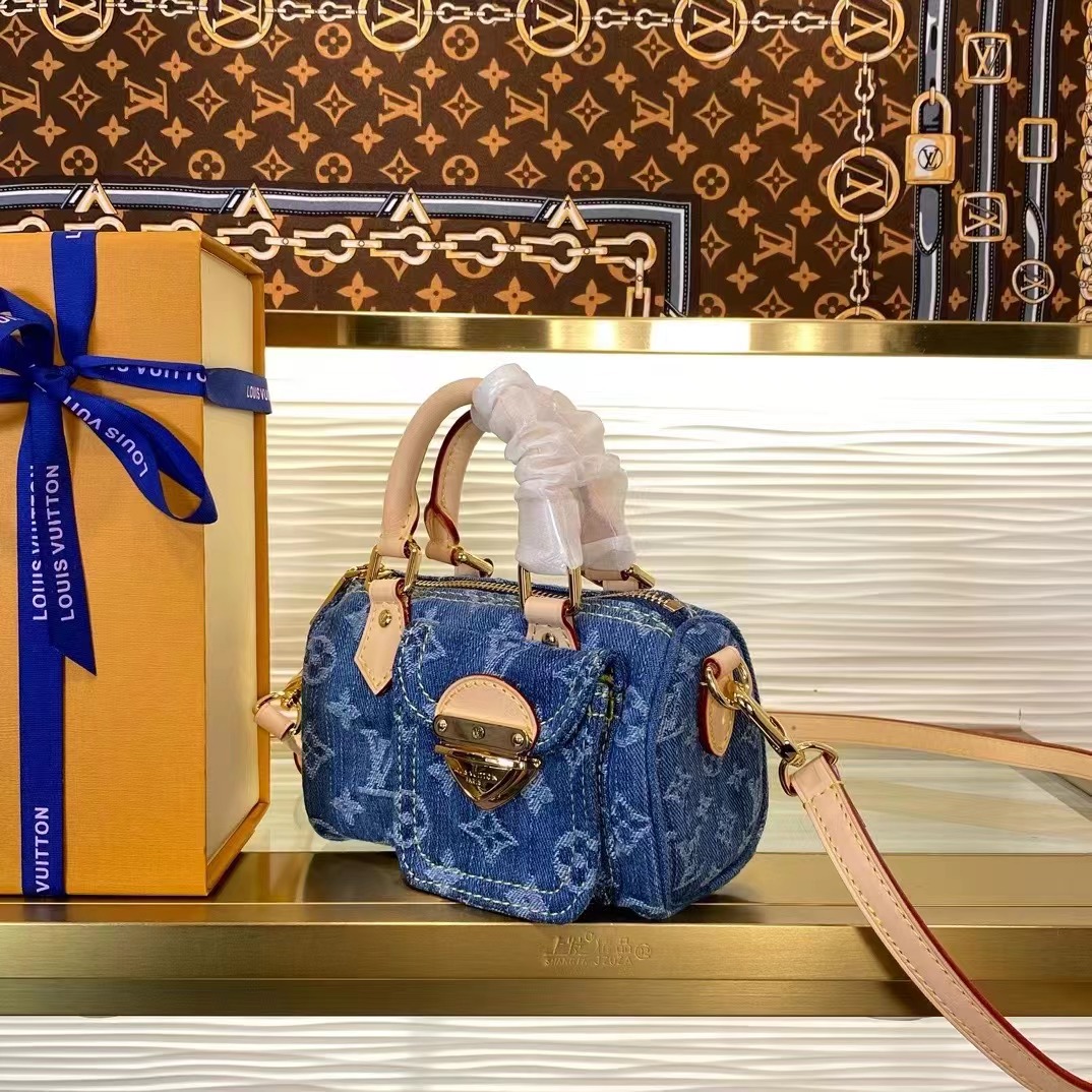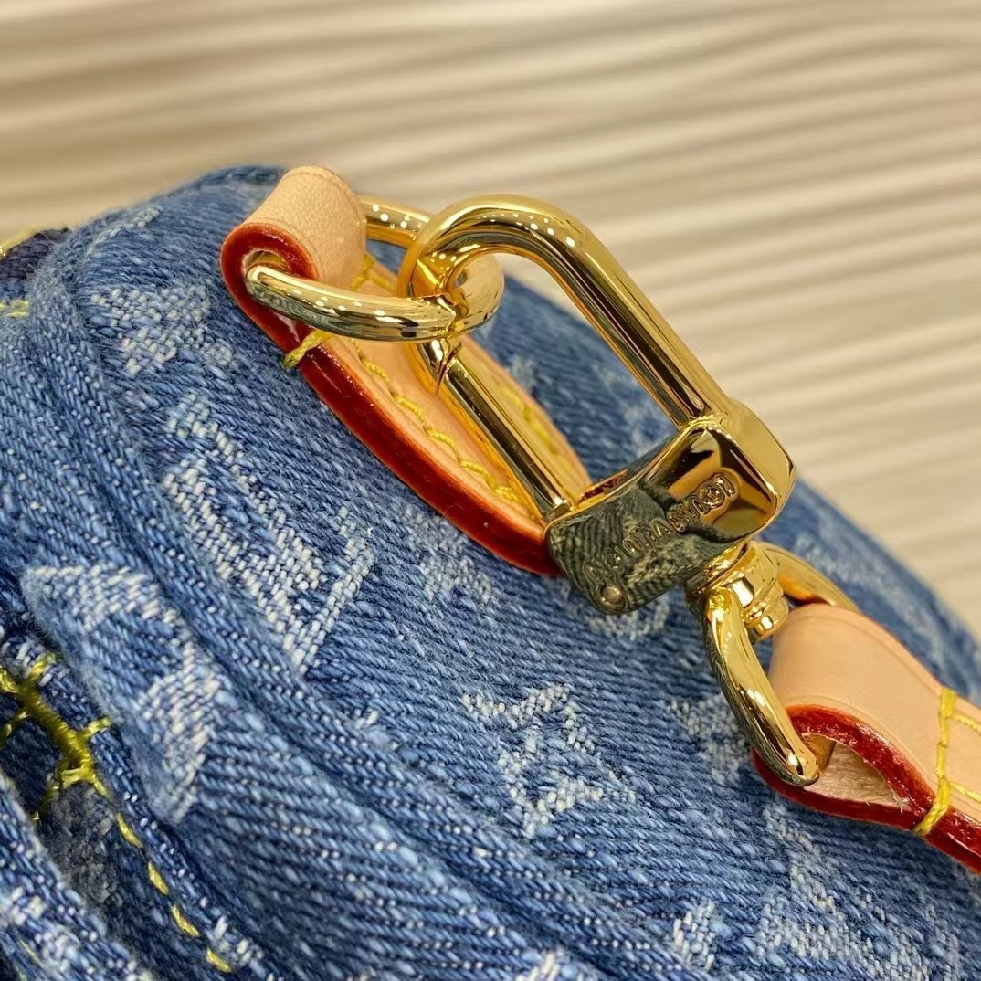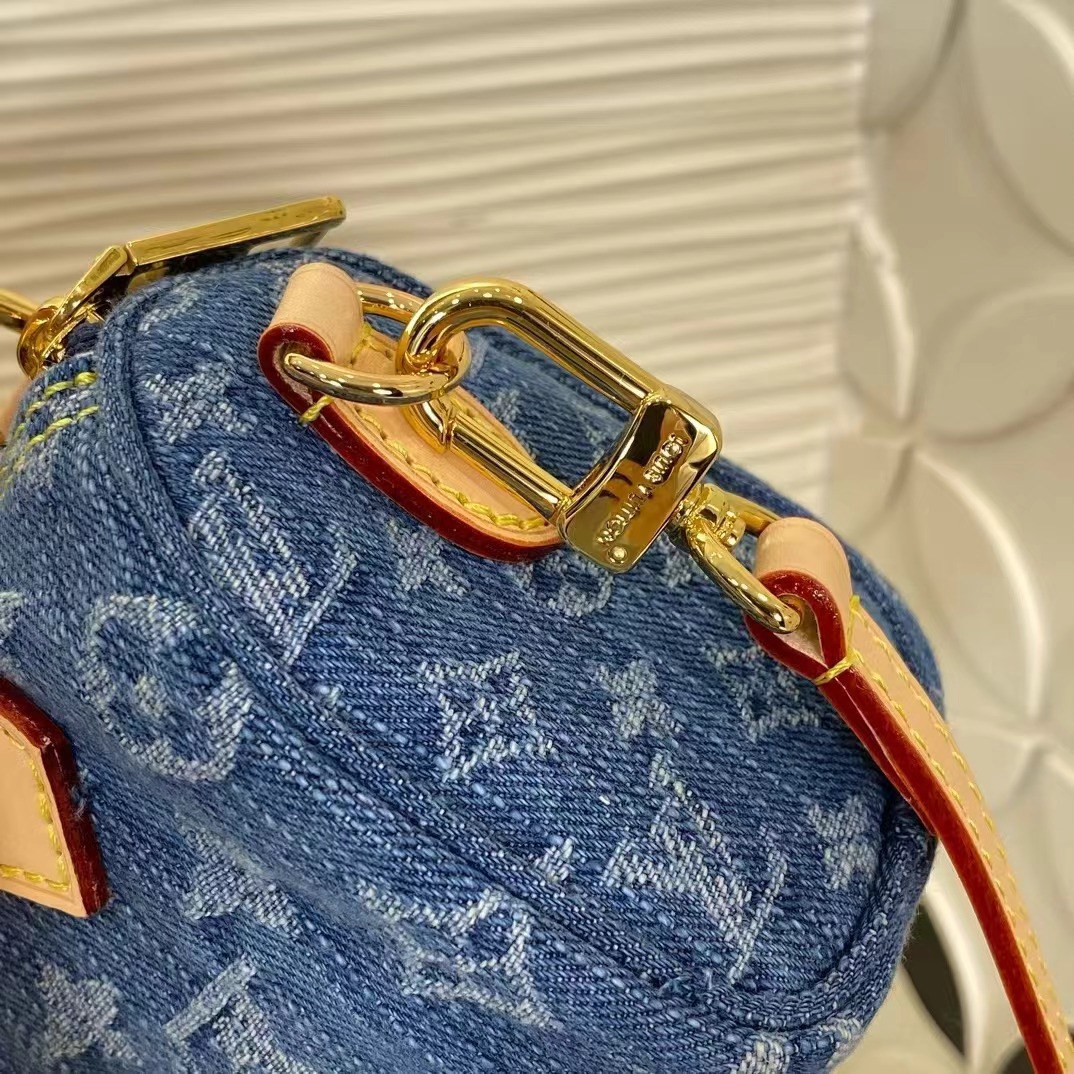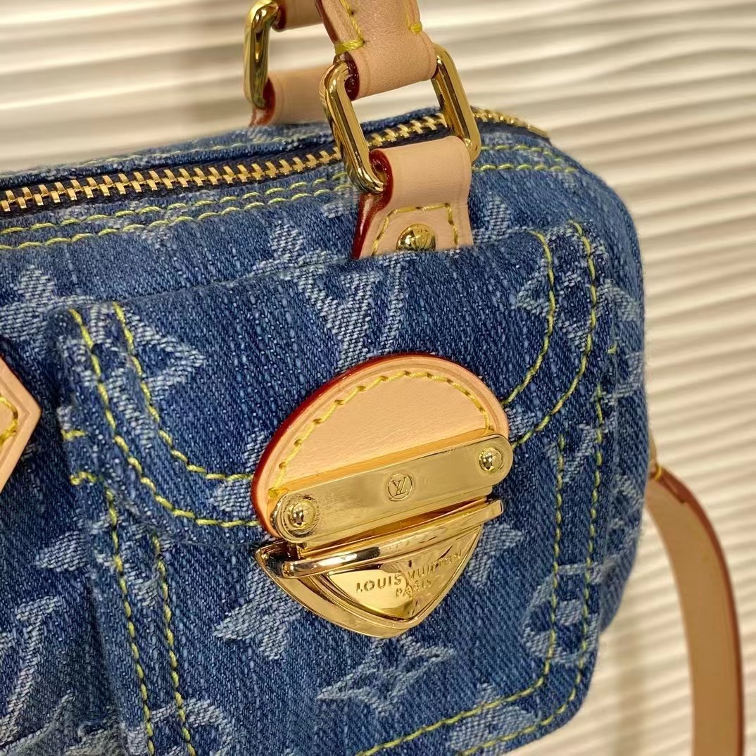 本款 Nano speedy 手袋選用由認證棉織就的 Mongogram Denim 砂洗帆布