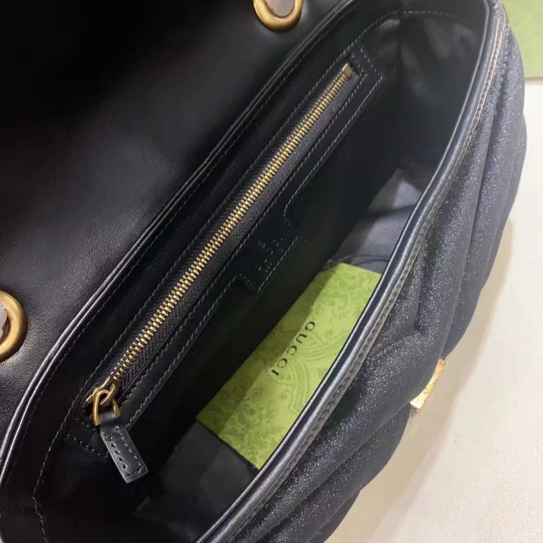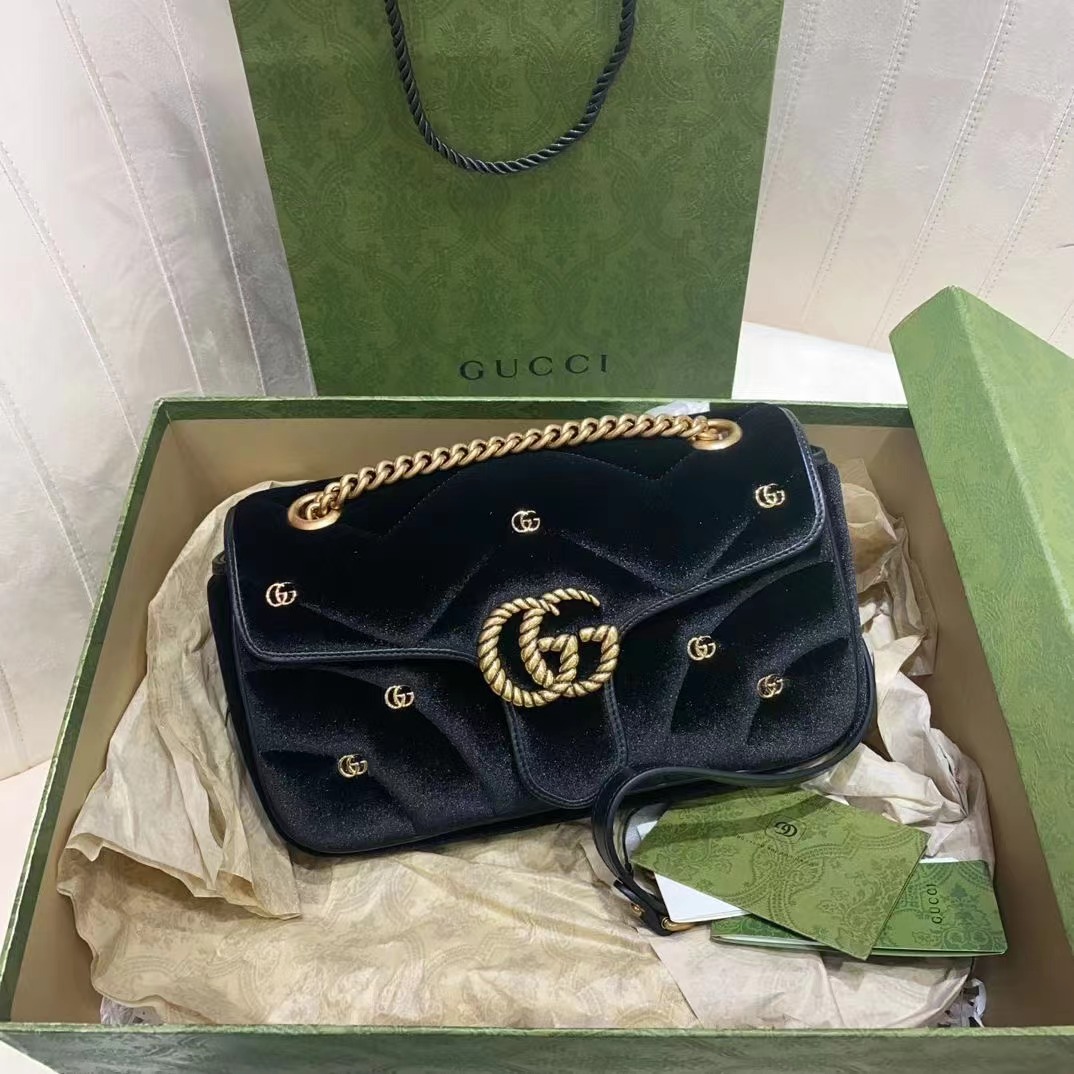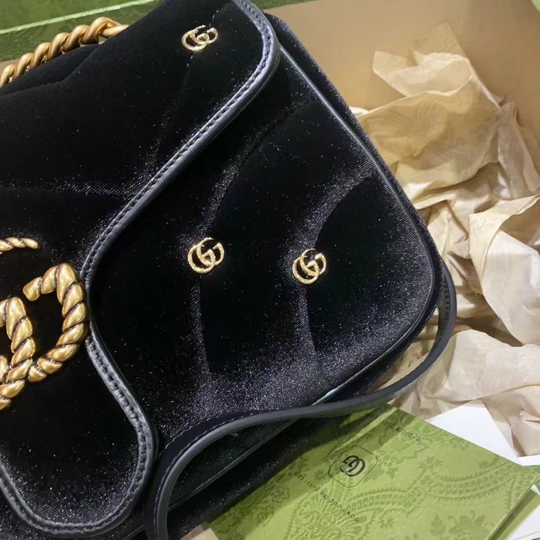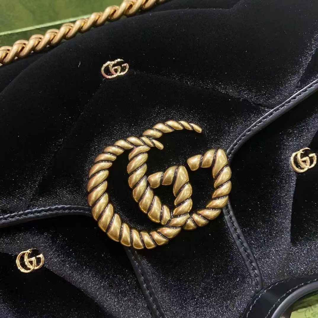 采用柔軟加襯設計,以黑色天鵝絨制作,精心綴飾小巧雙G鉚釘和擰花飾帶雙G造型裝飾配件