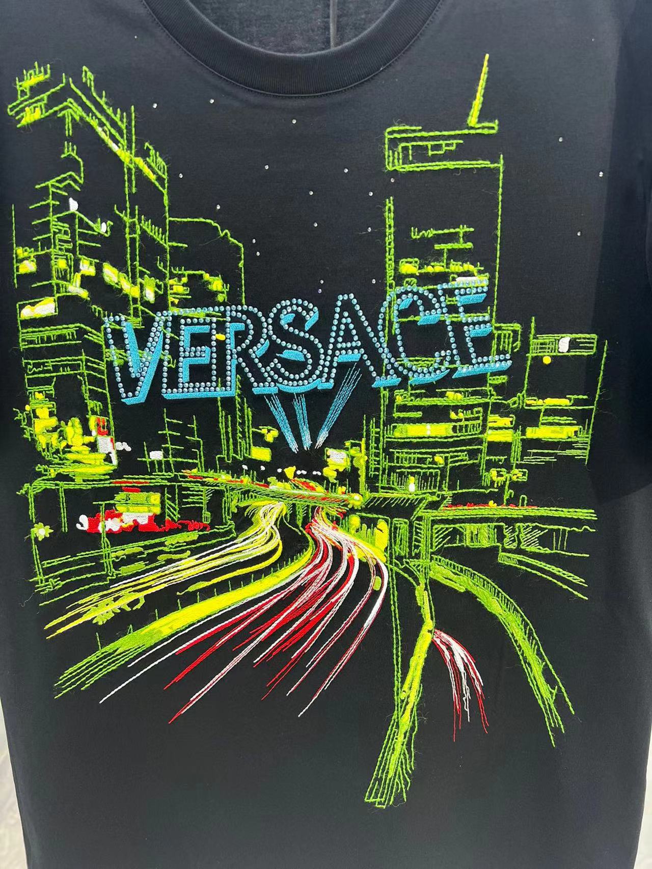 新品男裝水晶點綴彩色刺繡都市霓虹短袖棉質T恤,正面水晶點綴都市霓虹燈刺繡