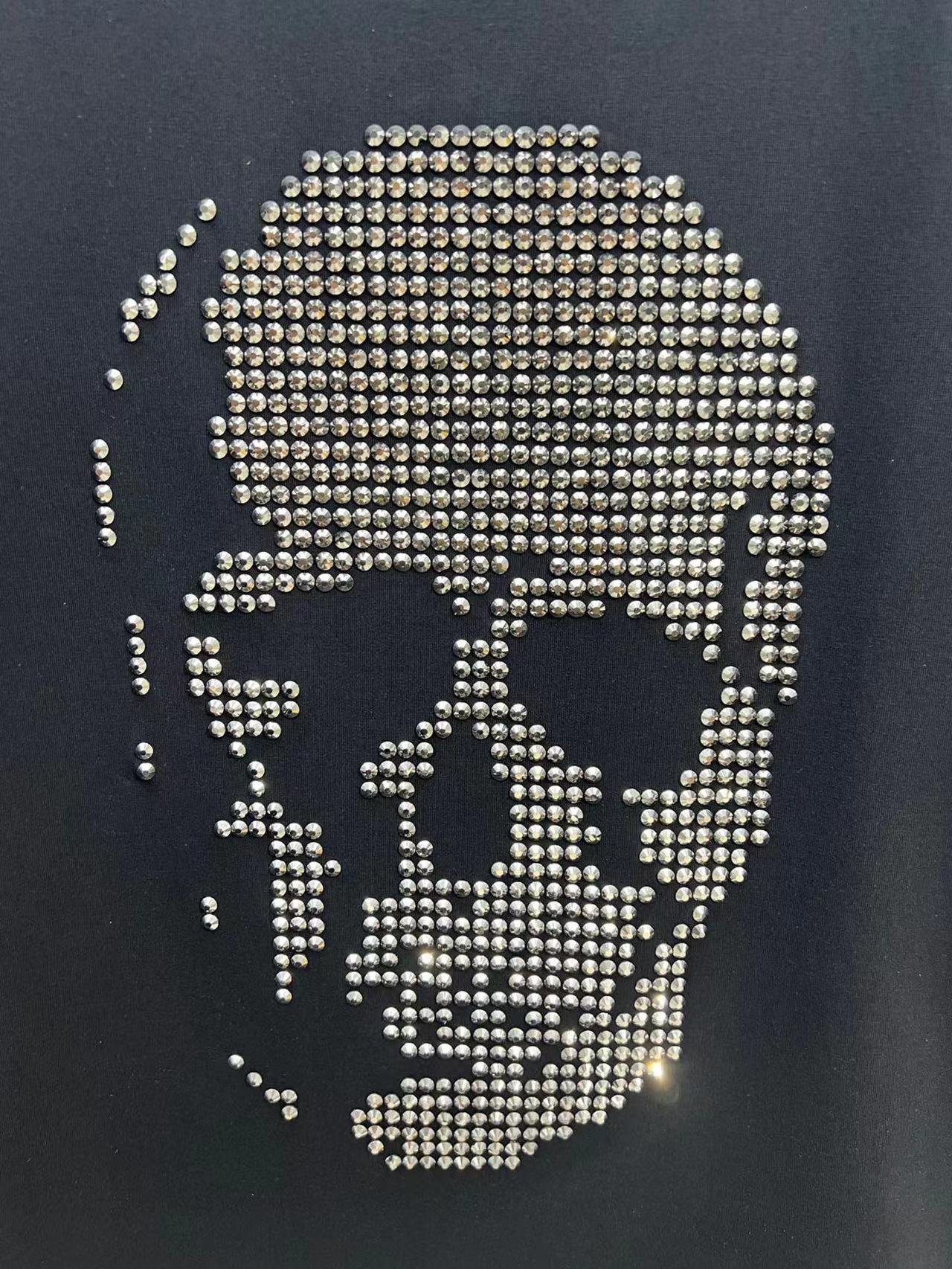 新品水晶骷髅圖案圓領短袖T恤,正面裝飾經典元素骷髅水鑽,
