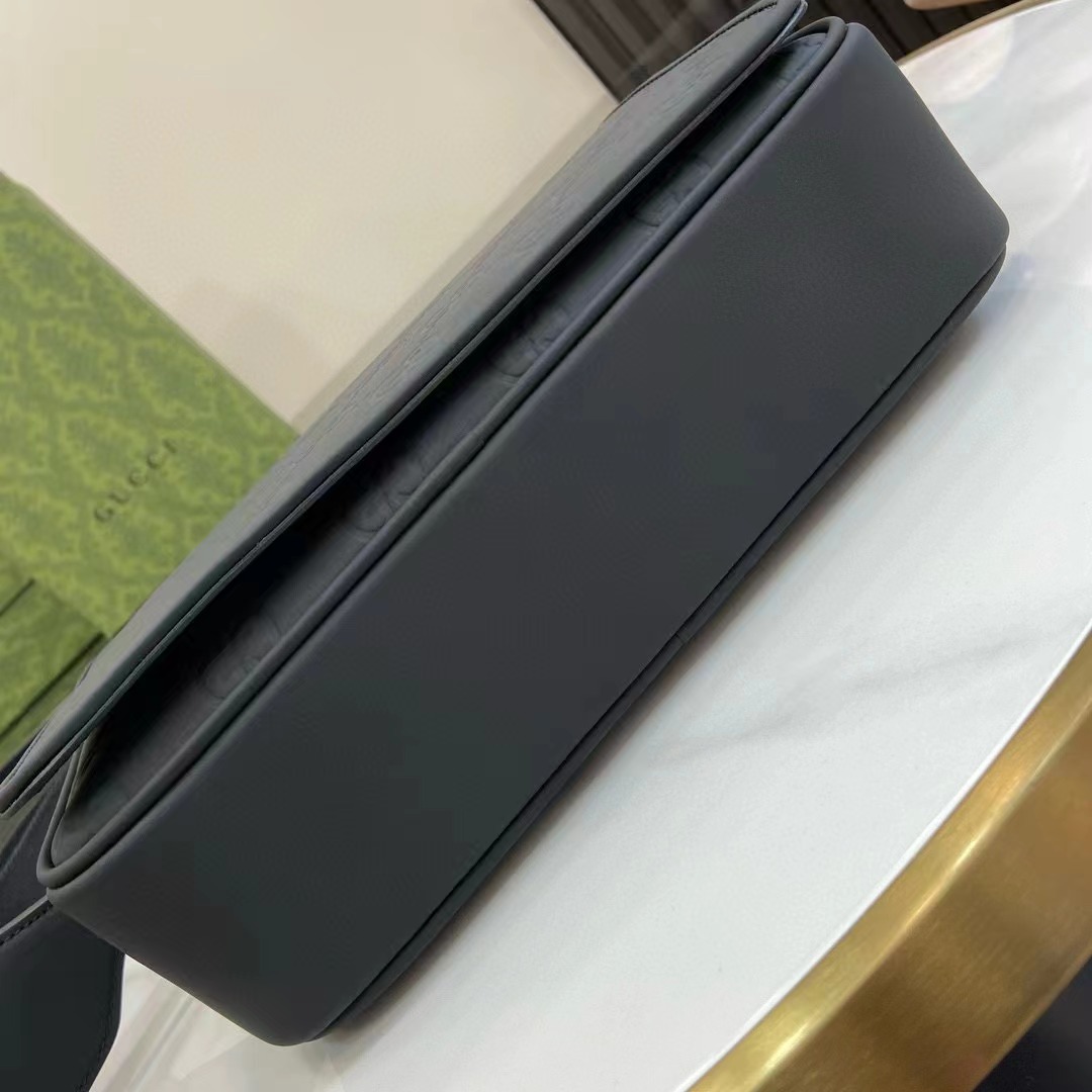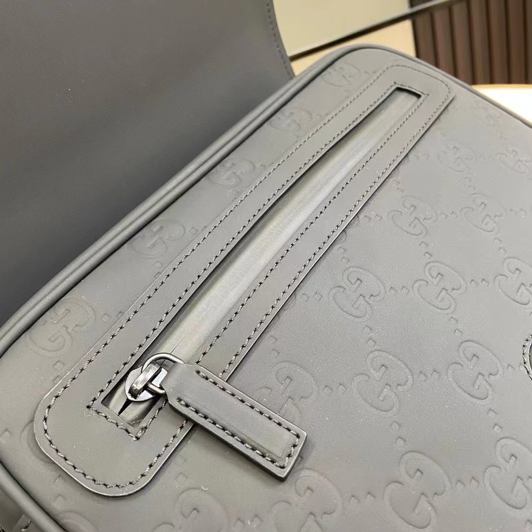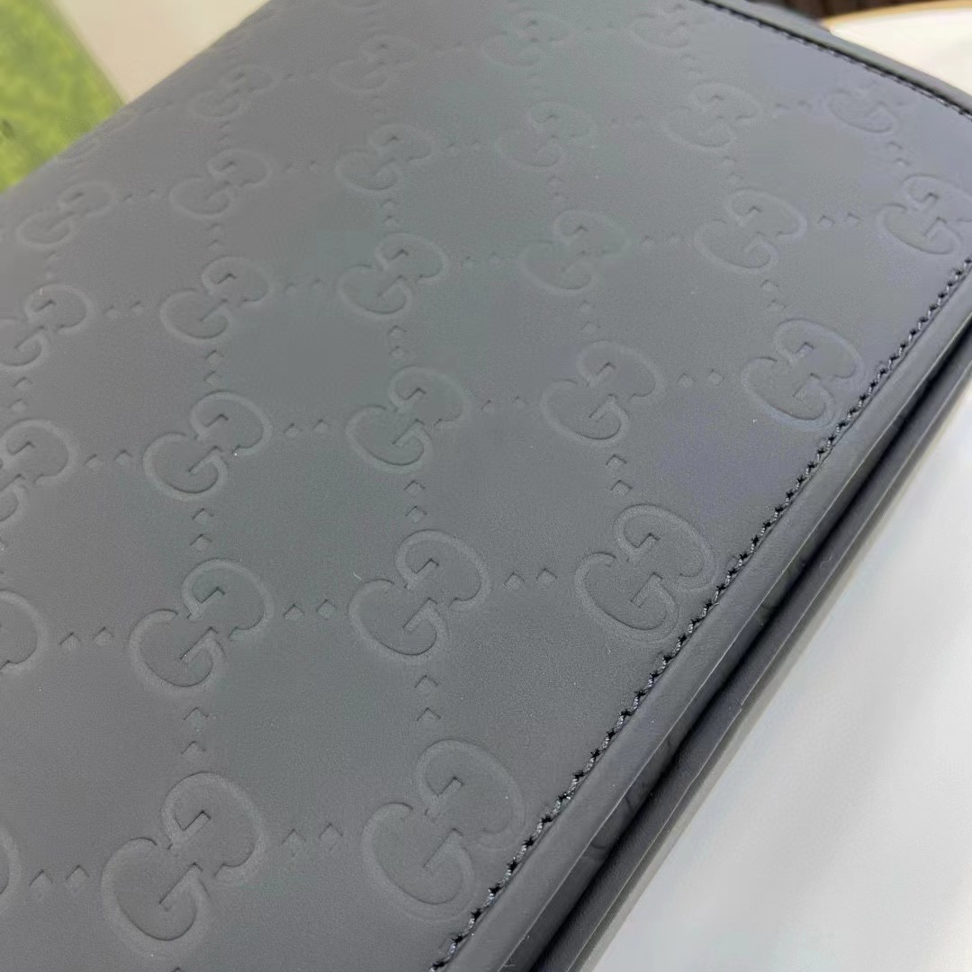 GG斜挎包。一系列以黑色橡膠效果皮革打造的男士包袋閃亮登場,