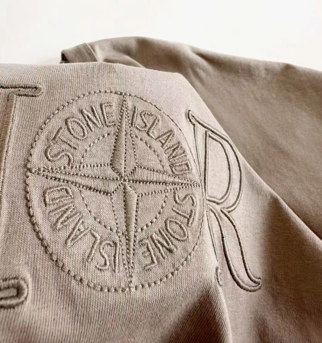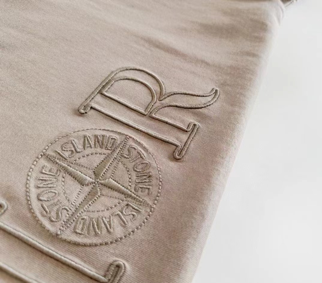 幅立體繡花,袖口織帶定然,400g1×1羅紋領口,四線密邊,