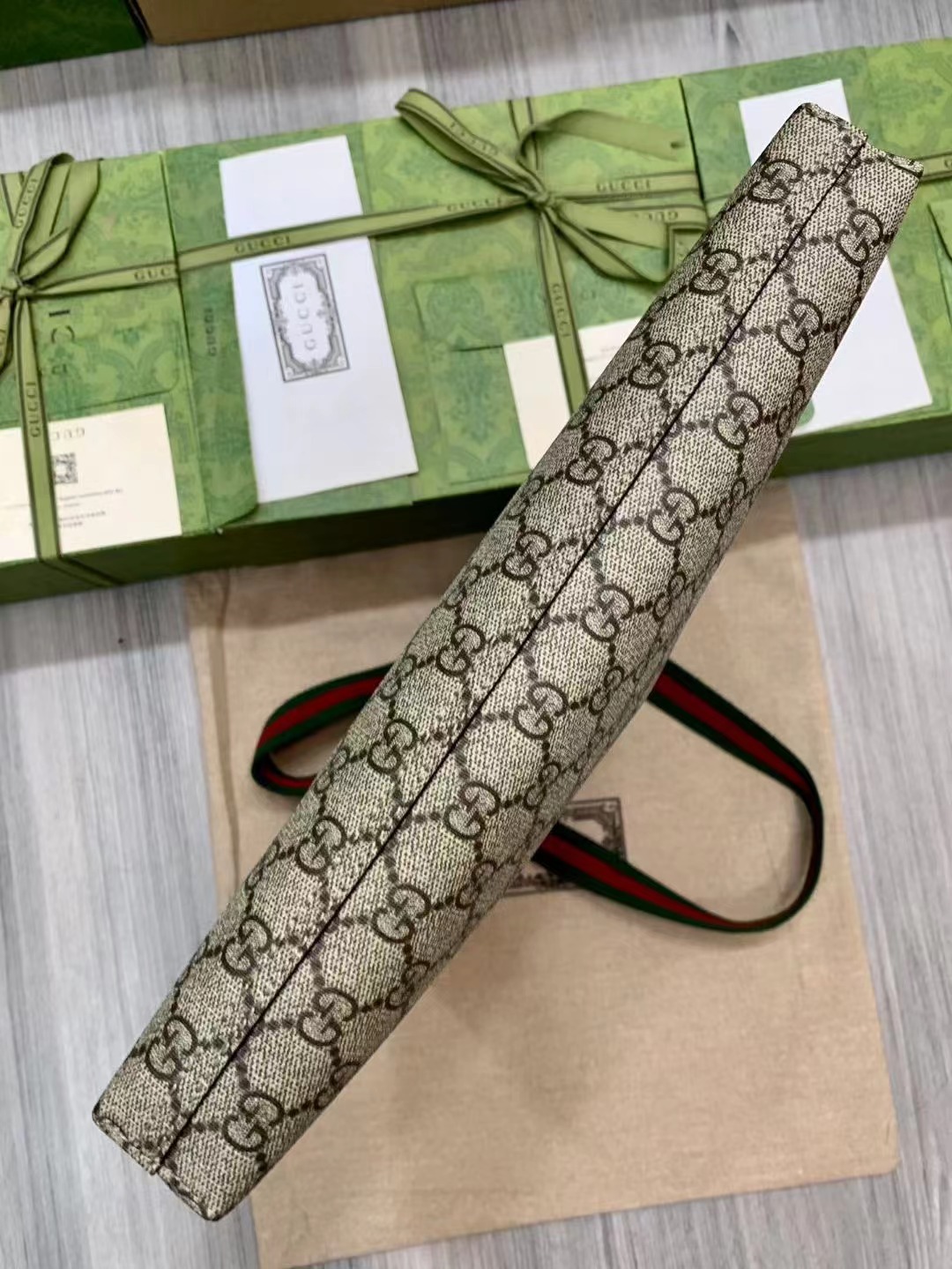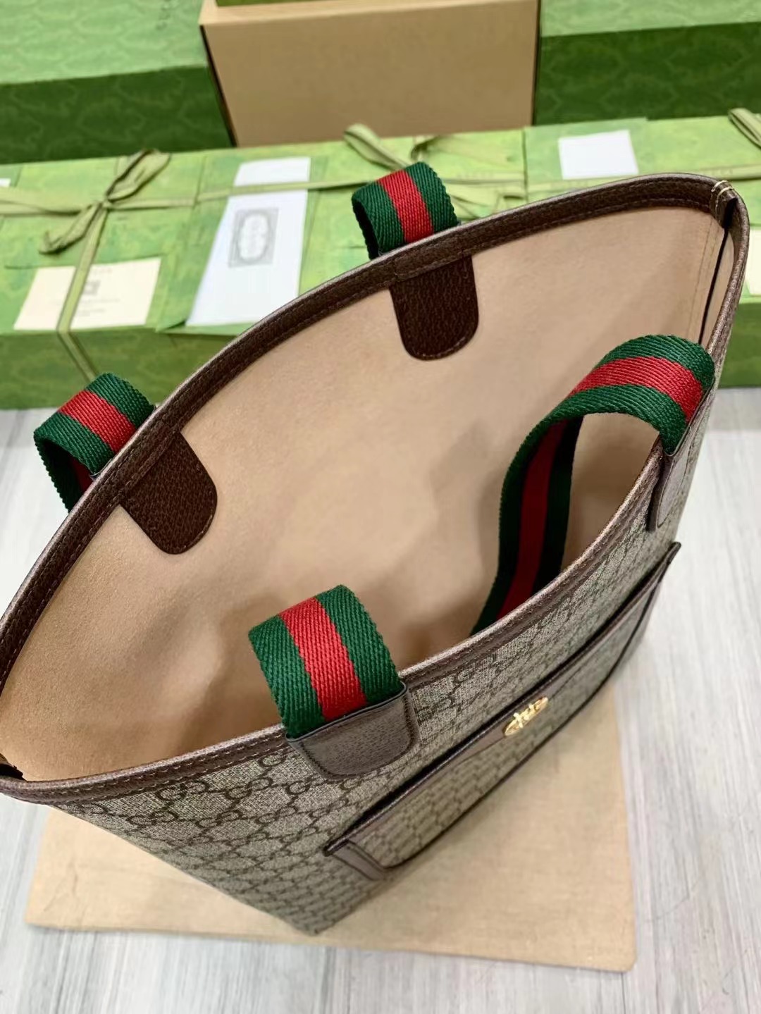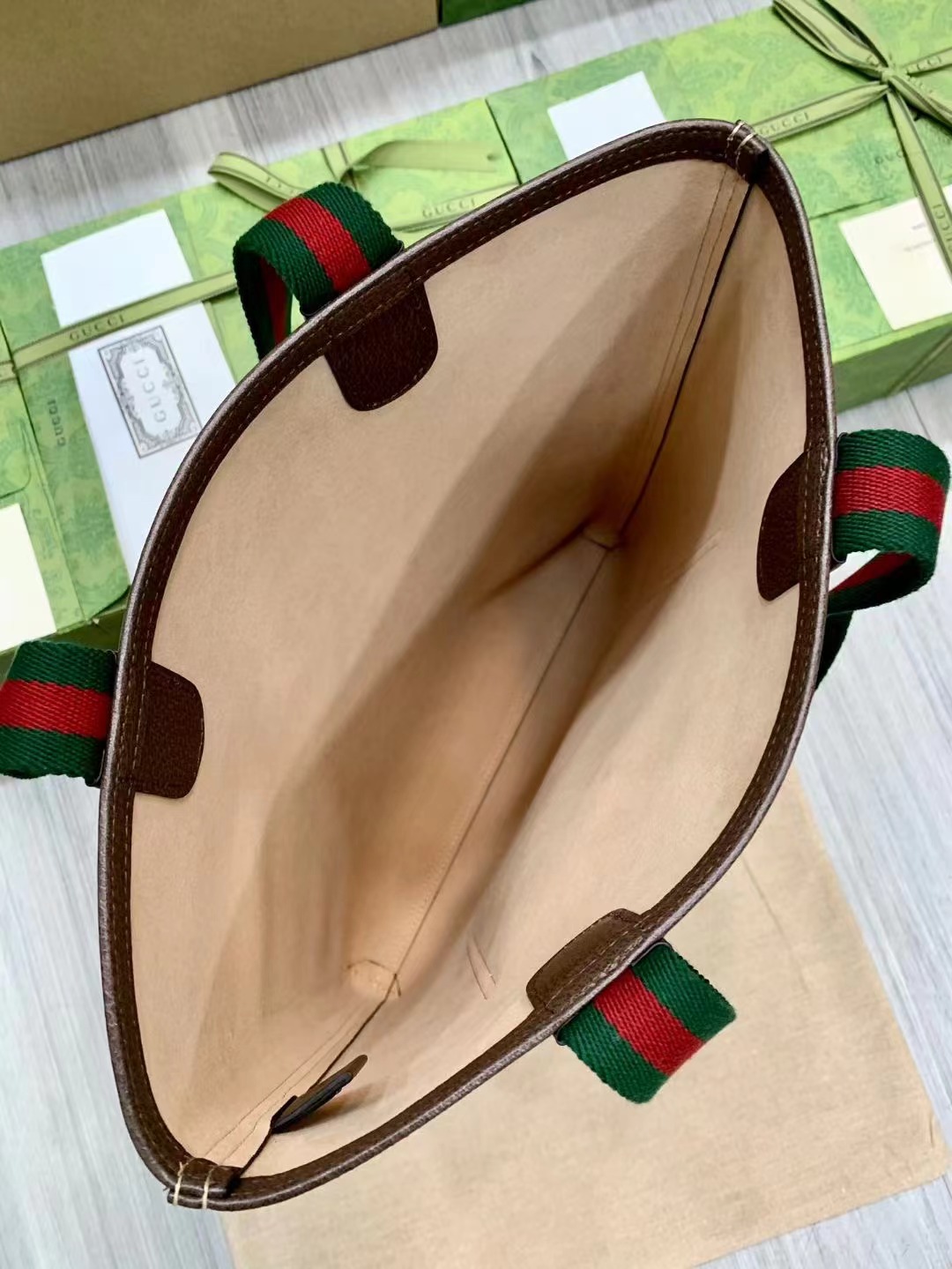 在這款小號托特包上,紅綠條紋織帶與米色和烏木色GG Supreme