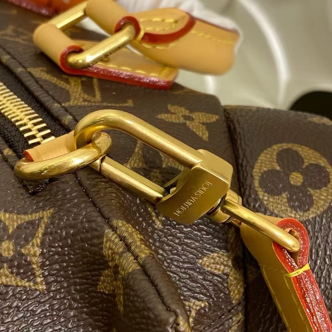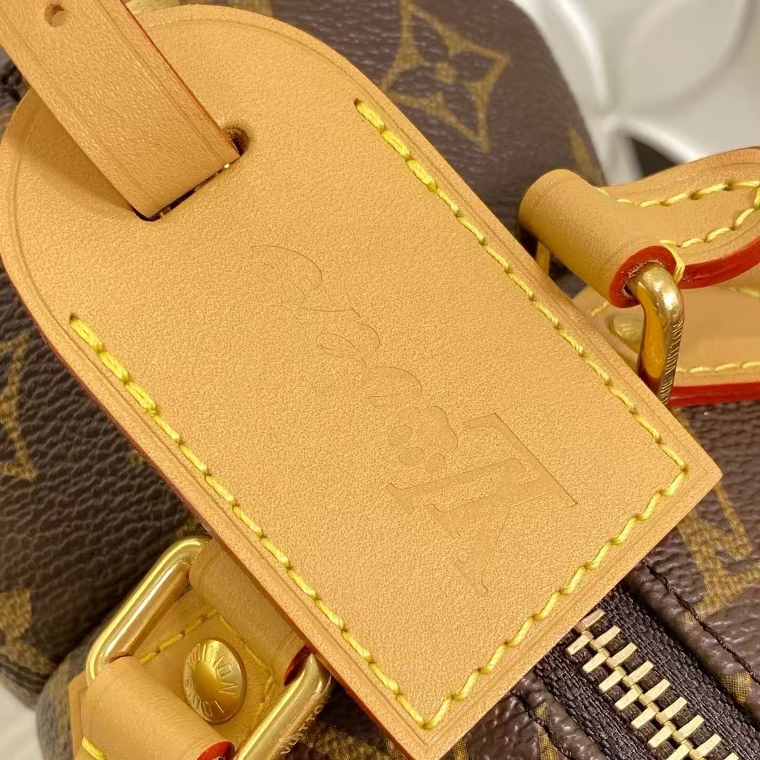Monogram帆布包身融入做旧饰边,皮革裁出顶部手柄、