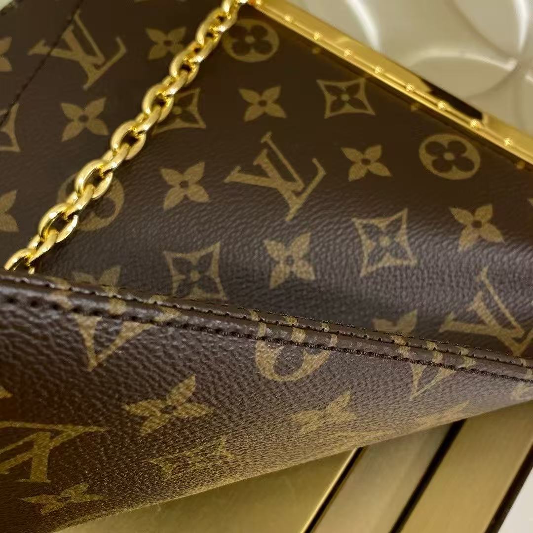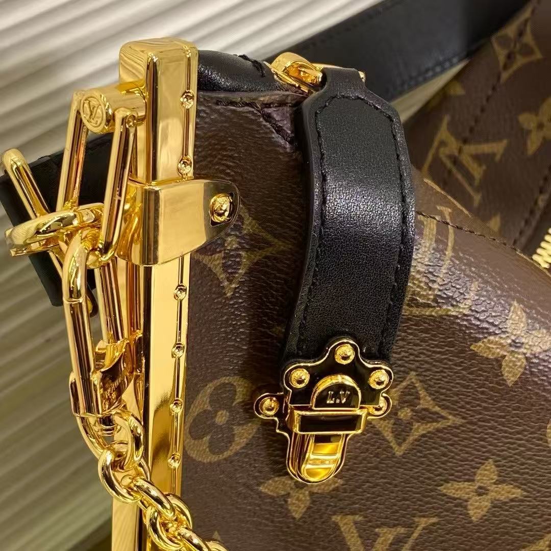 以經典 Monogram 帆布搭配金屬框架和瑩亮鎖扣。