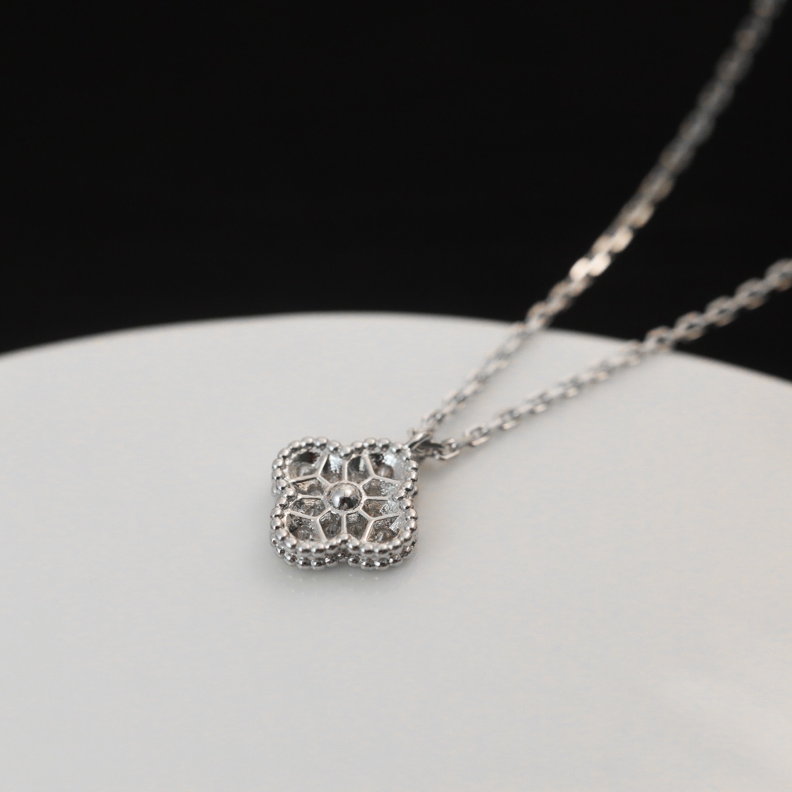 mini四葉草單花滿鑽項鏈(鏈條925銀材質,CNC菱形扣) mini型號的四葉草規格1cm吊墜,對比小號1.5cm單花尺寸更加協調。疊戴搭配是一款不可缺少的選擇。