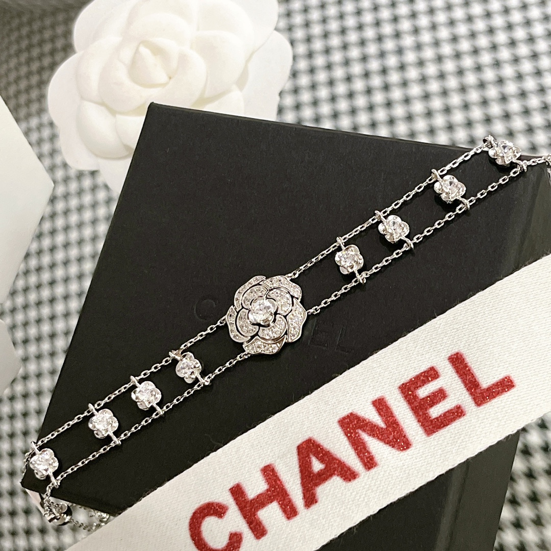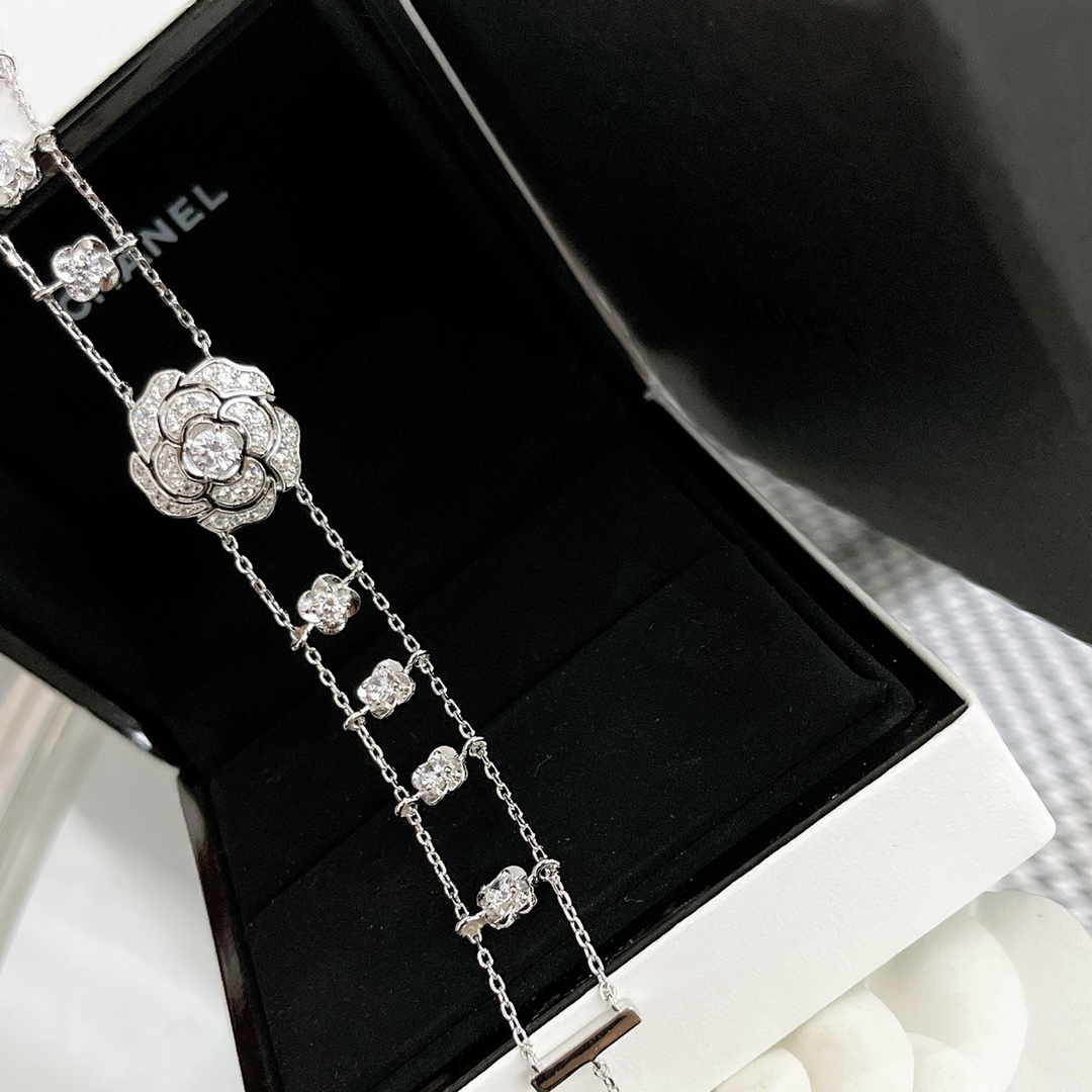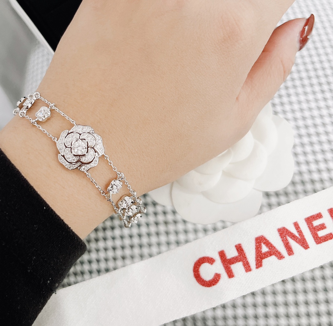 B578 小香家今年的爆款【CAMéLIA 手鏈】山茶花不只是一朵花,它更是靈感之源。極富曲線美感的山茶花,呈現百變風格。手工鑲嵌鑽石,非常奢華的一款項鏈,採用進口 V金材質電鍍厚金,保色程度更久。手鏈