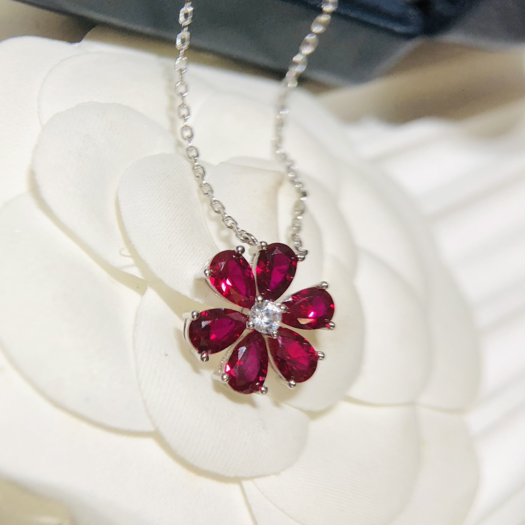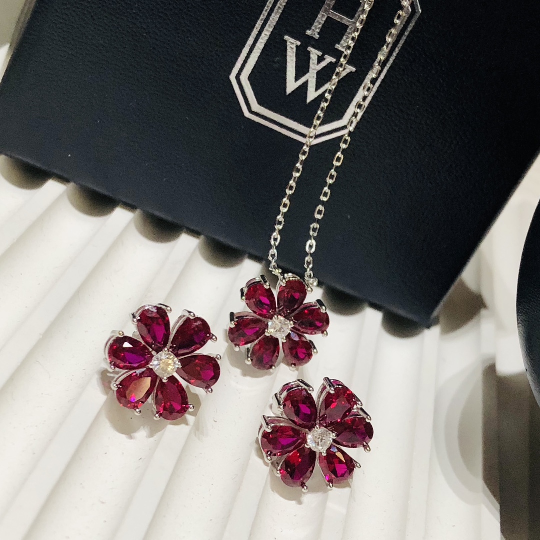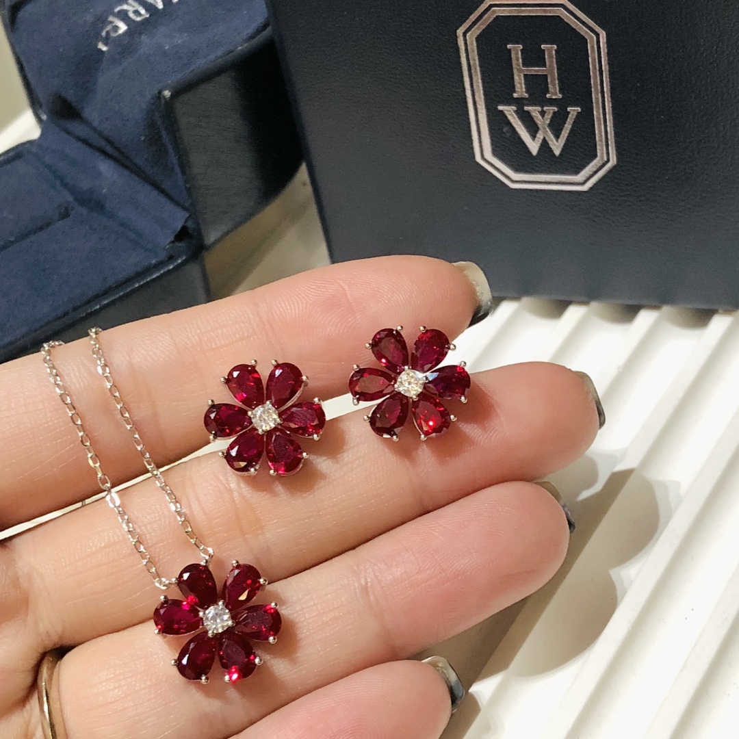 C397 Hw 海瑞溫斯頓 23C新款 紅寶石 花朵項鏈 耳釘 套裝 精選德國進口s925純銀材質電鍍厚金 不褪色不過敏 精工打造原版一比一定制 超精工 blingbling 項鏈 耳釘