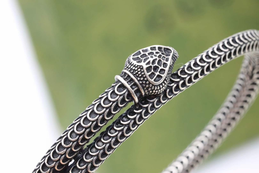 此款靈蛇造型的手鐲,匠心選用具有做舊效果的純銀材質製成精緻的刻花圖案栩栩如生地再現了靈蛇的鱗片。 廣闊的大自然和野生動物一直是品牌摯愛的兩大靈感源泉,靈蛇造型也已經成為 Gucci Garden 珠寶配飾系列的象徵之一。 風格非常朋克