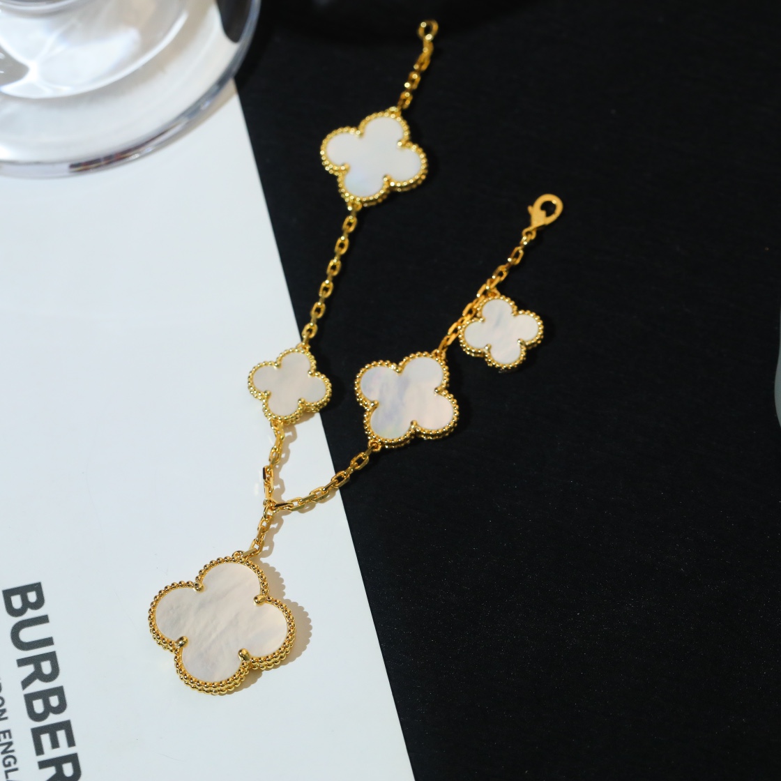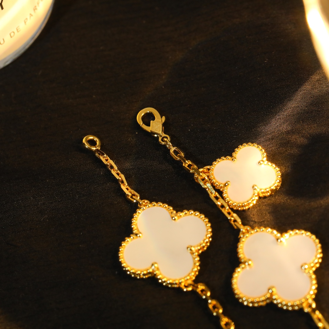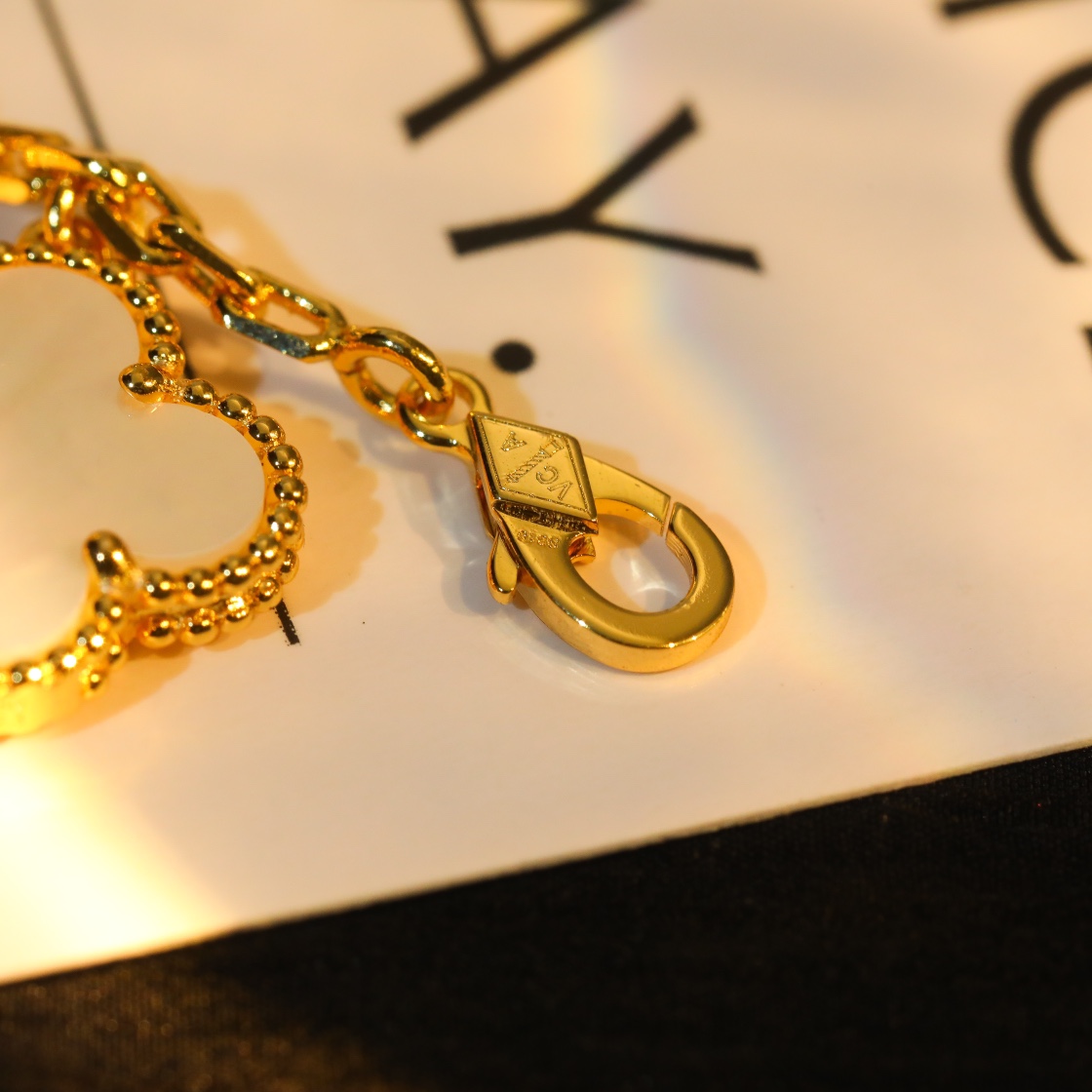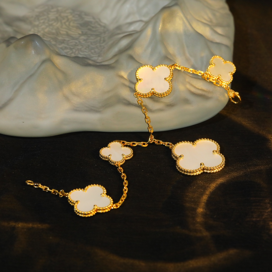 Magic不規則圖案四葉草手鏈,經典四葉草幸運圖案設計,不同尺寸的搭配圖案,融合高級感的天然貝母,立體感十分吸引。