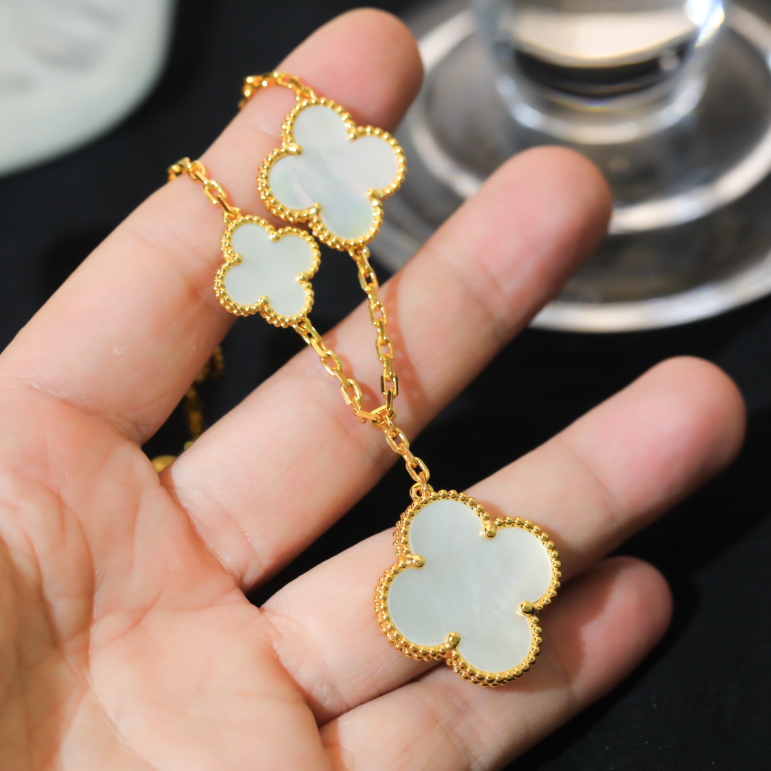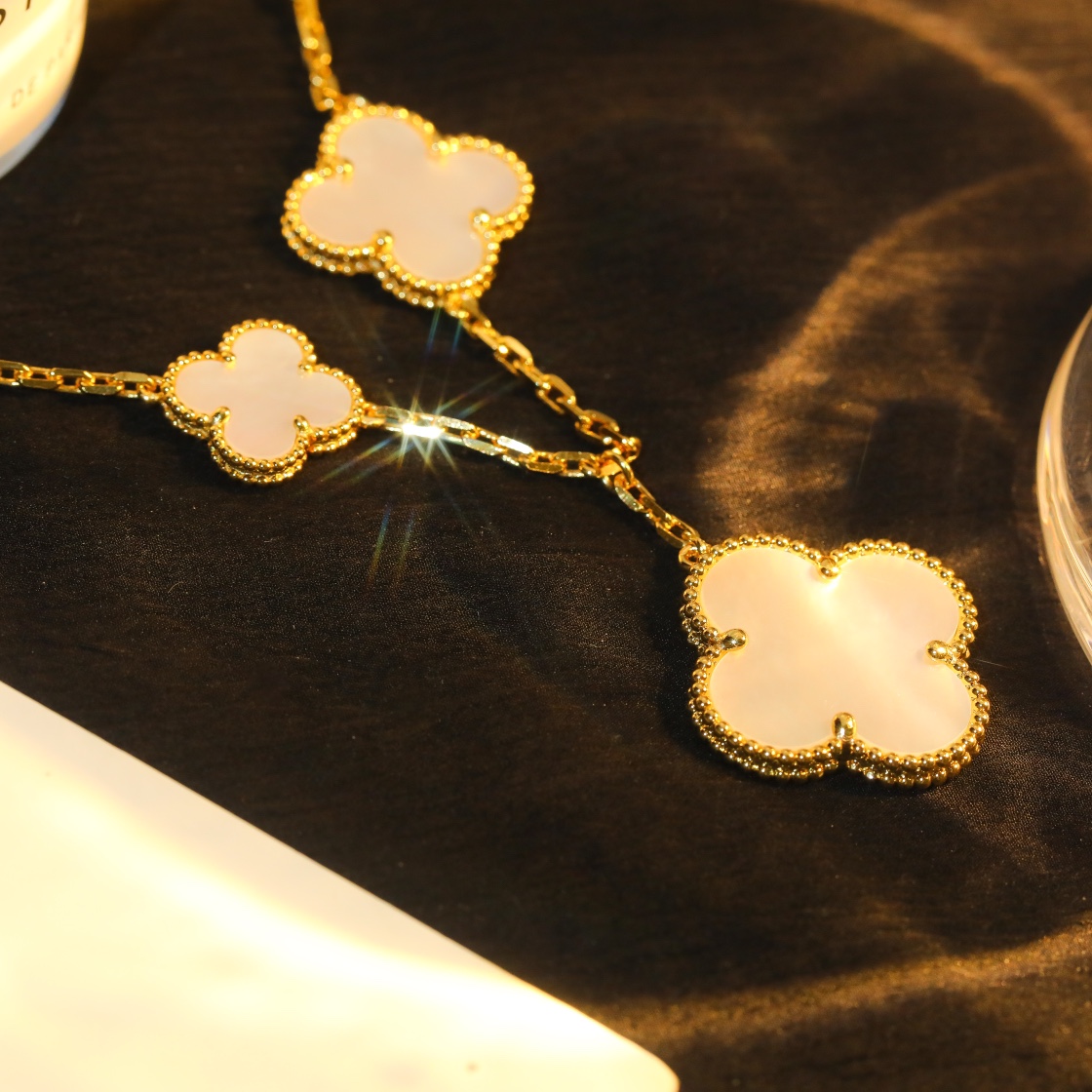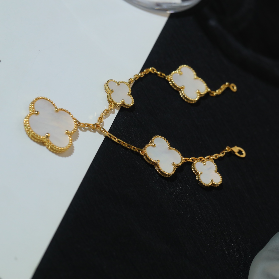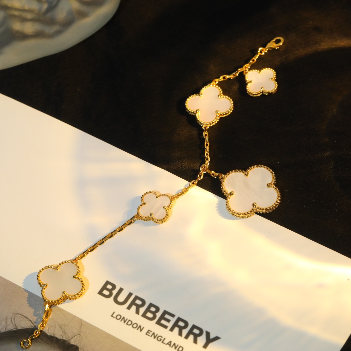 Magic不規則圖案四葉草手鏈,經典四葉草幸運圖案設計,不同尺寸的搭配圖案,融合高級感的天然貝母,立體感十分吸引。