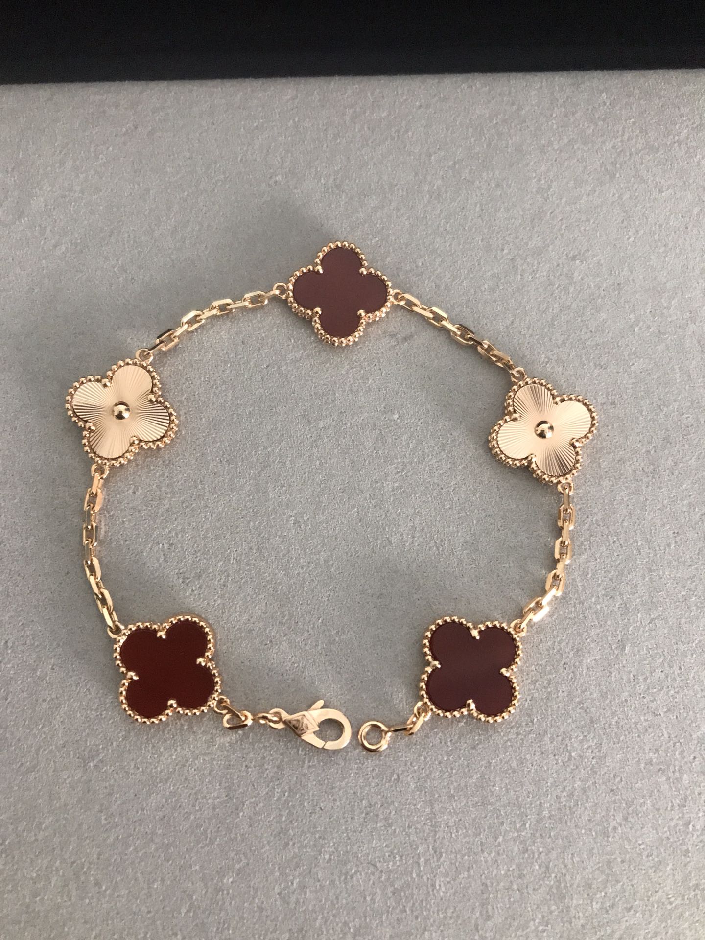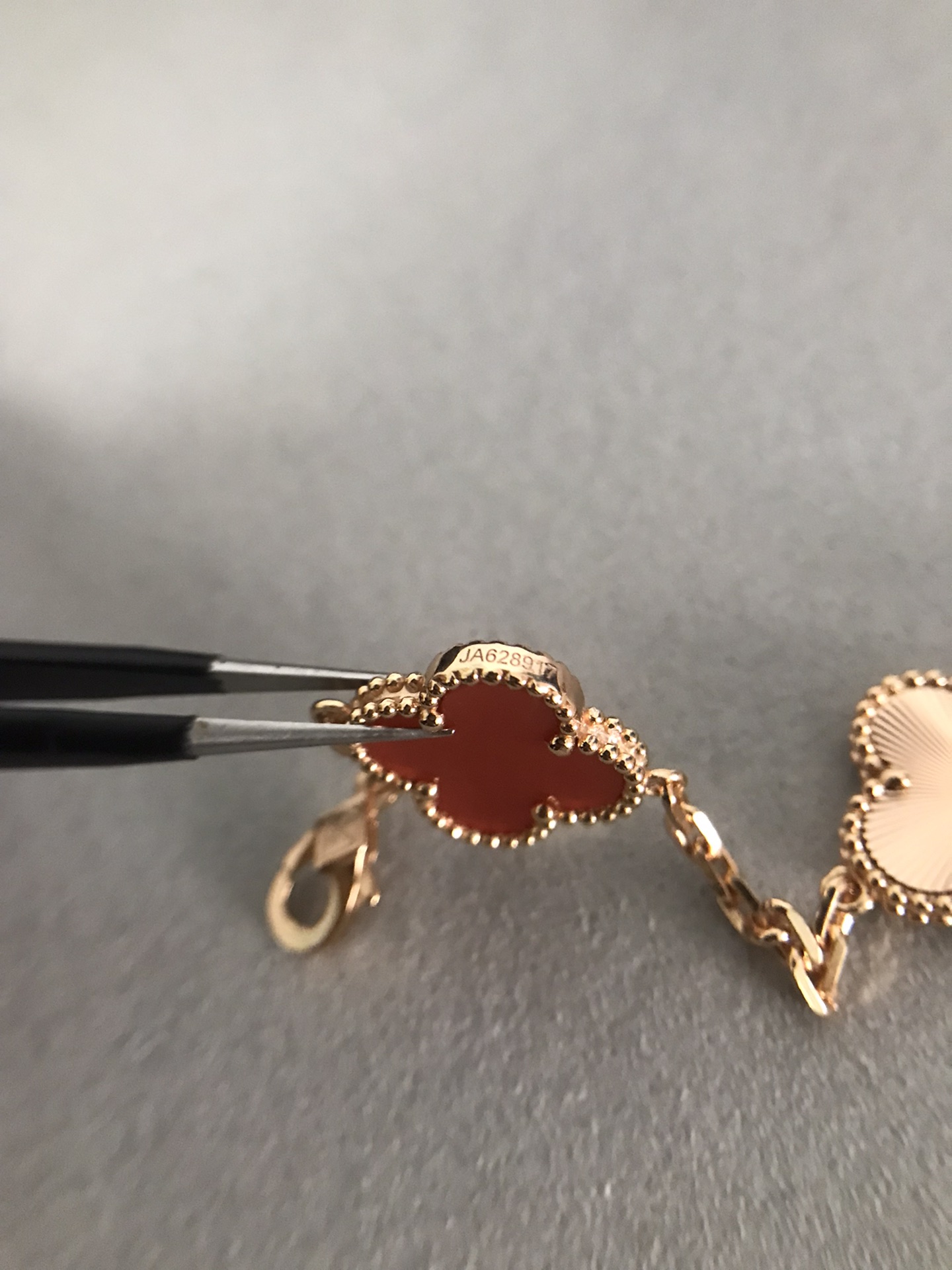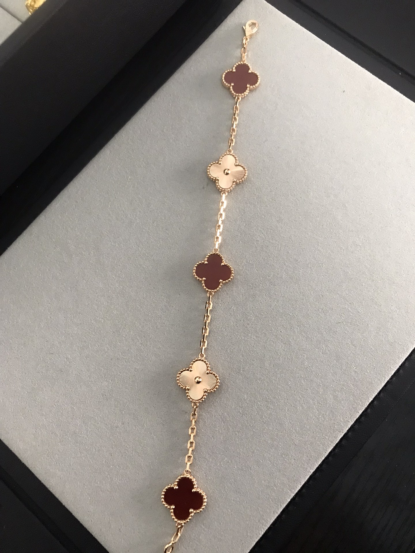 四葉草五花紅玉髓間鐳射手鏈[慶祝]沒有正版不開模[強][強][強]完全按照一比一複刻 按照珠寶工藝流程嚴格出貨歡迎對比你自己的正版和閨蜜的正版[得意][得意][得意] 1扣子是CNC扣別家一個扣子2塊錢我家一個扣子10多塊2鏈條是粗版對版鏈條 整個市面只有銀鏈條對版其他v金 銅 鋼 沒有對版的鏈條3貝母這一塊都是天然的貝母合成貝母便宜2塊錢 天然的幾十不等 3貝母厚度就是2mm 其他尺寸都是不對的 沒有什麼薄版 厚板 只有唯一標準 [破涕為笑]4刻字的話 扣頭有刻字 第一朵花兩邊刻字 尾鏈有防偽標 這些都是標配 5純手工鑲嵌貝母做到無縫鑲嵌 高工藝 6這款鐳射是CNC精雕線條到細 其他細節都可以對比 我就不多說啦 一款無法用言語表達它的美喜歡到最大程度的時候高貴大氣 太絕了 閉眼入吧