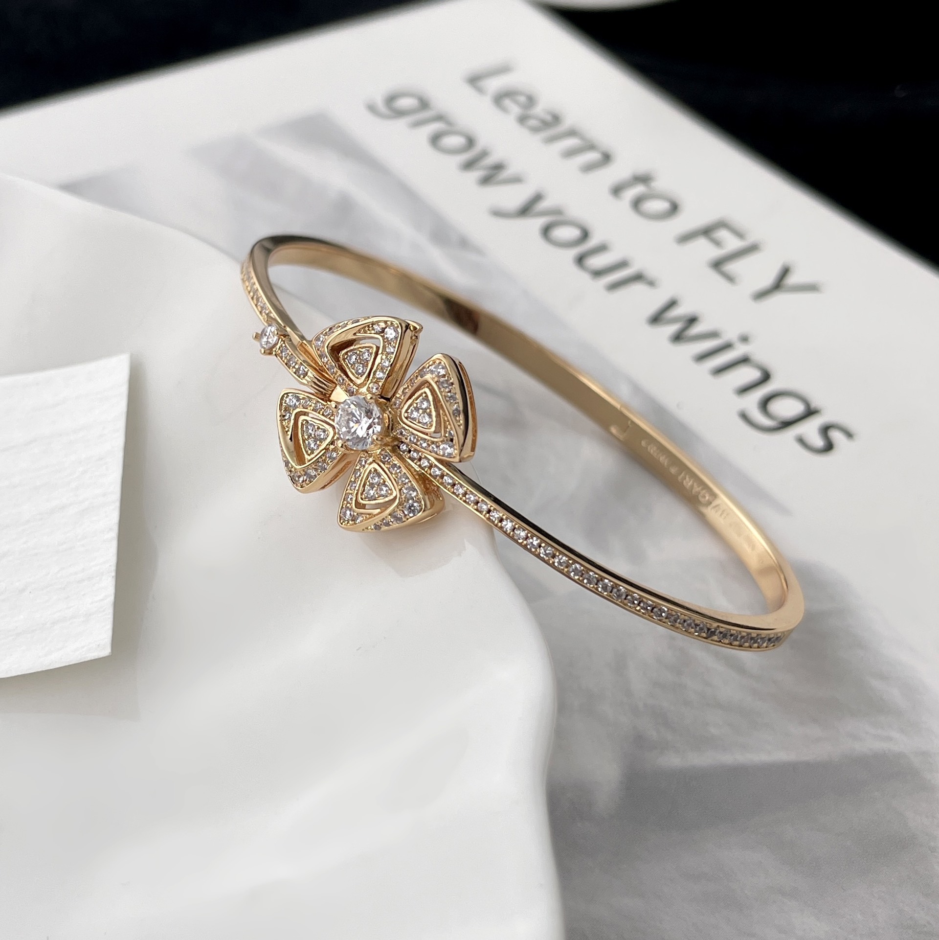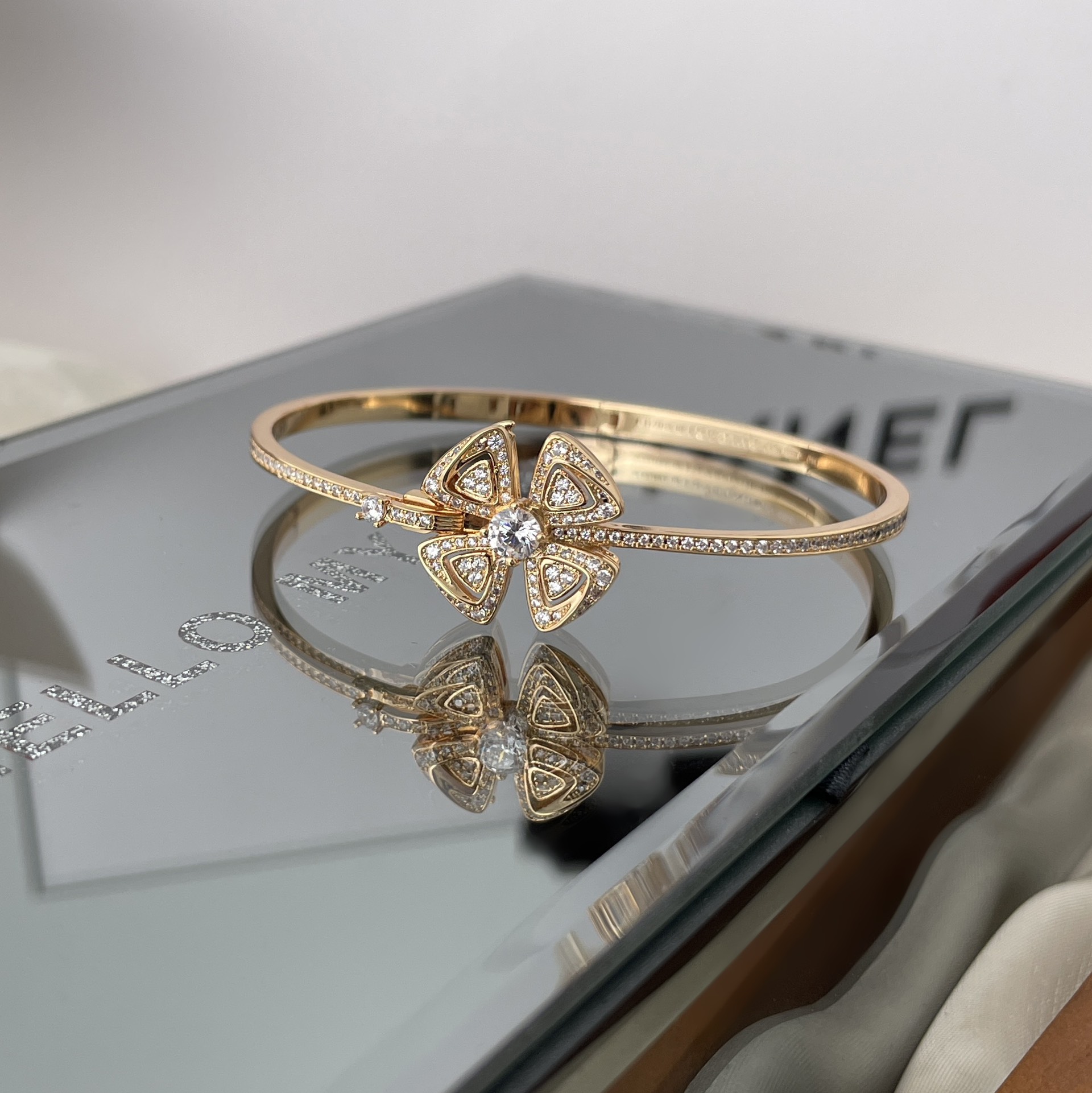 寓意幸福與快樂的八瓣花,搭配秋冬季真的就是絕了!鏤空花瓣圍繞著中間鑲嵌的鑽石,那種光芒在店內的燈光下一打,襯得整個人超美,一美吧~就讓我特別有花錢的衝動