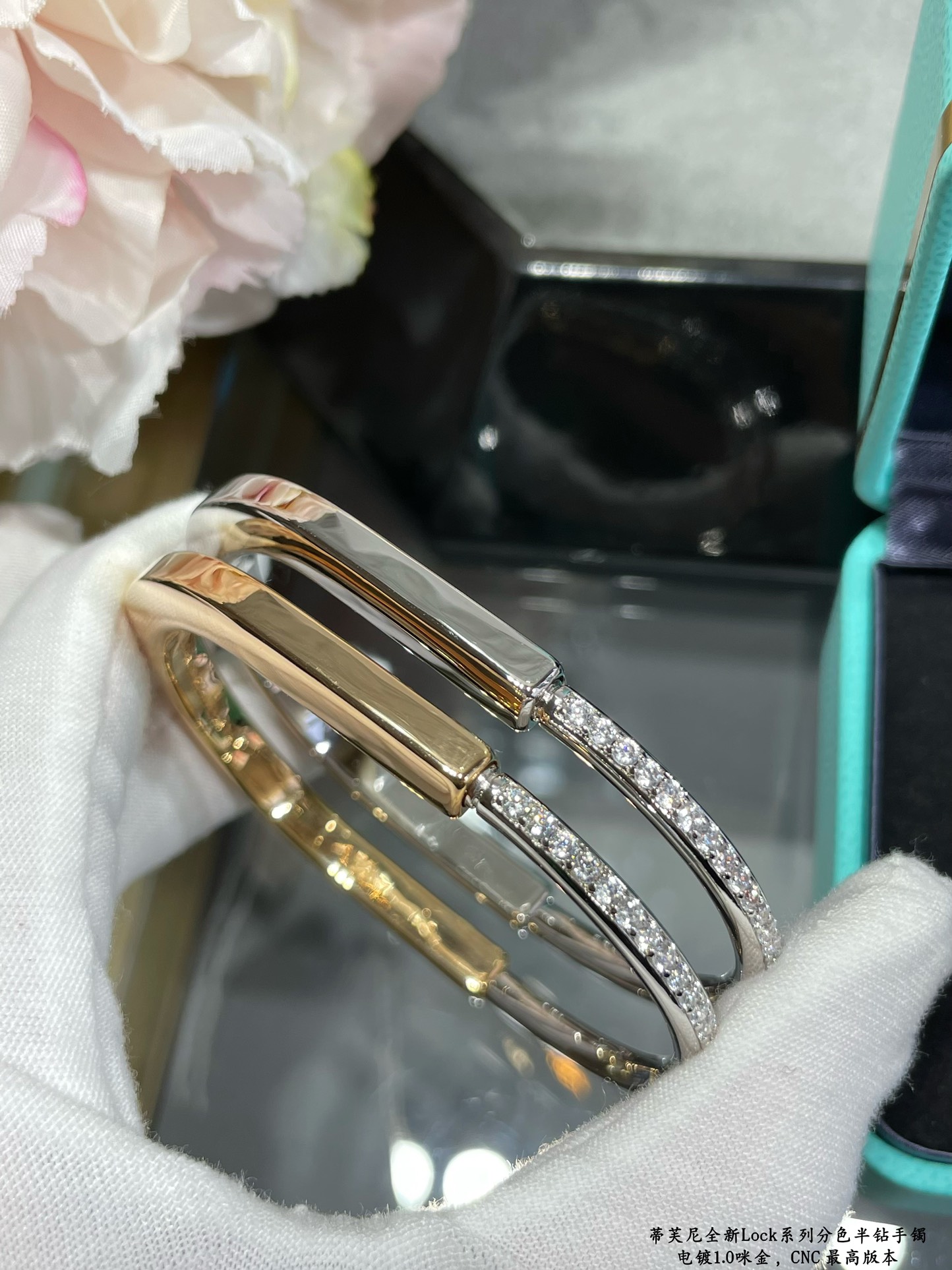 V金鍍1.0咪金 碼數:16.17顏色:白金 玫瑰金 。Tiffany 蒂芙尼lock分色半鑽鎖頭手鐲Tiffany 新款LOCK系列 無性別定義 亦可當情侶手鐲男女皆可佩戴極簡風格任何首飾皆可搭配扣環利用“掛鎖”機制別出心裁在中國有關“鎖”的寓意。