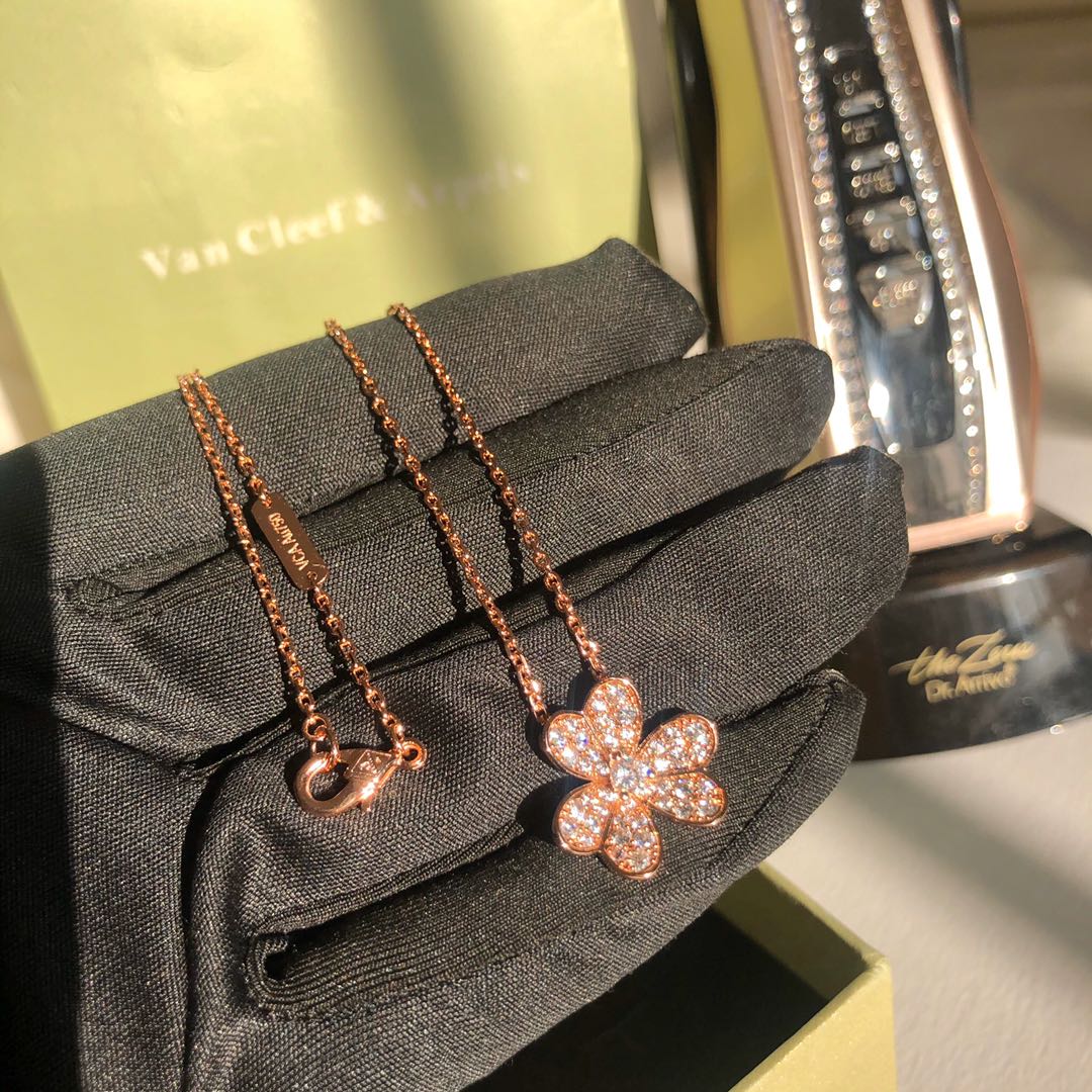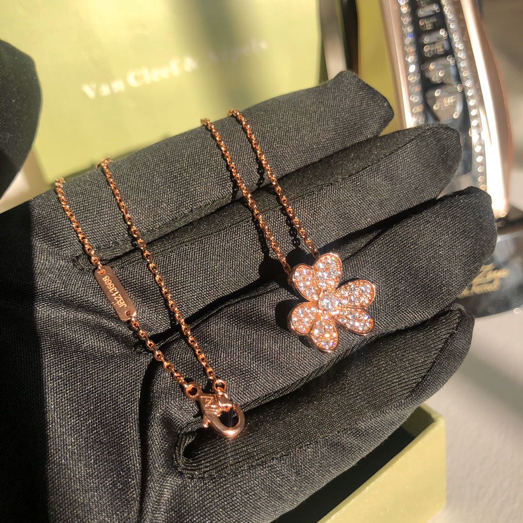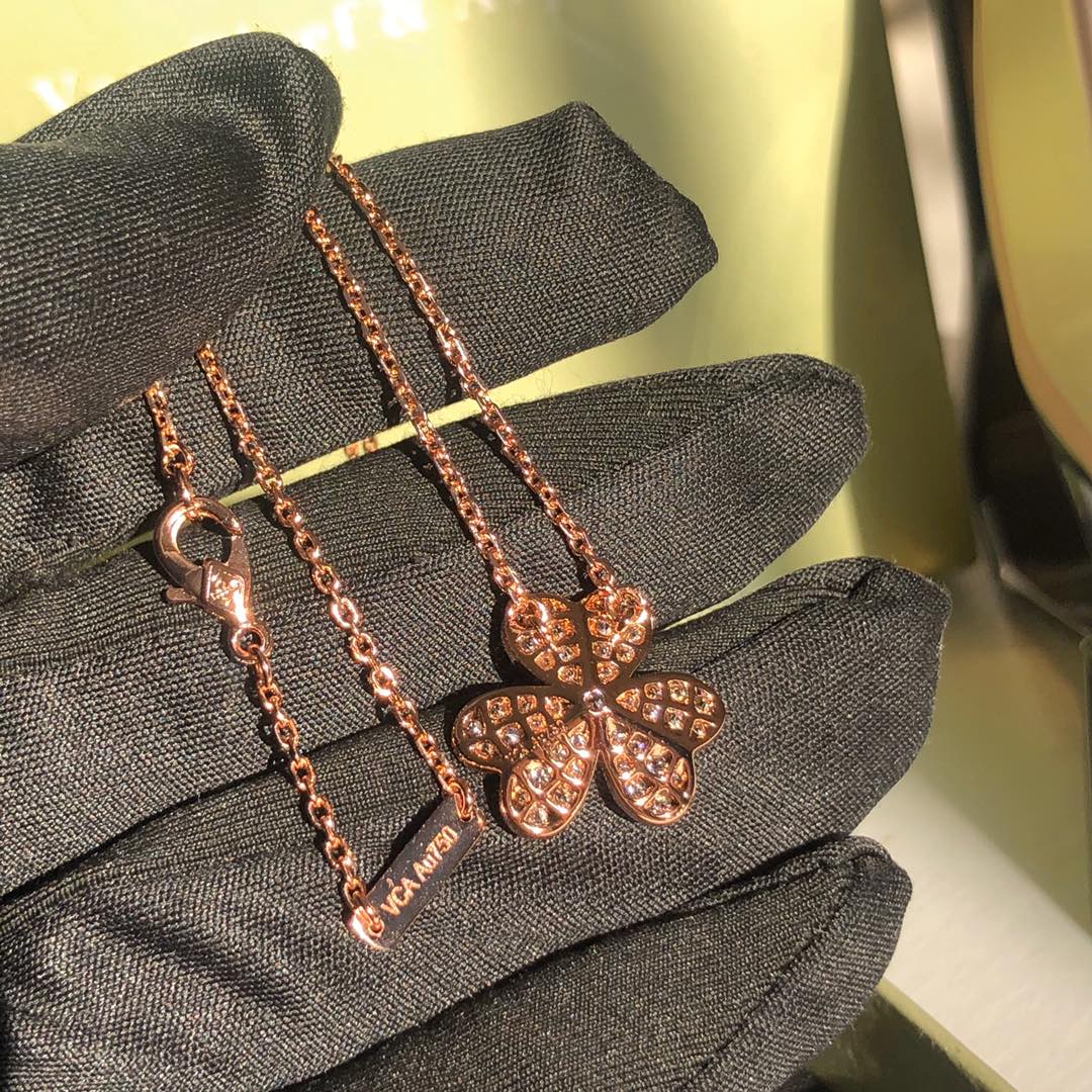 項鏈 精工品質 梵克雅寶VCA三葉花光面滿鑽項鏈 梵克雅寶Frivole系列宛若花朵吐蕊綻放,在微風輕拂下微微顫動,栩栩如生。鏡面拋光工藝,完美提升了金屬的亮度,使得花瓣交相輝映出耀目光影,每件作品都洋溢著獨一無二的活力氣息。