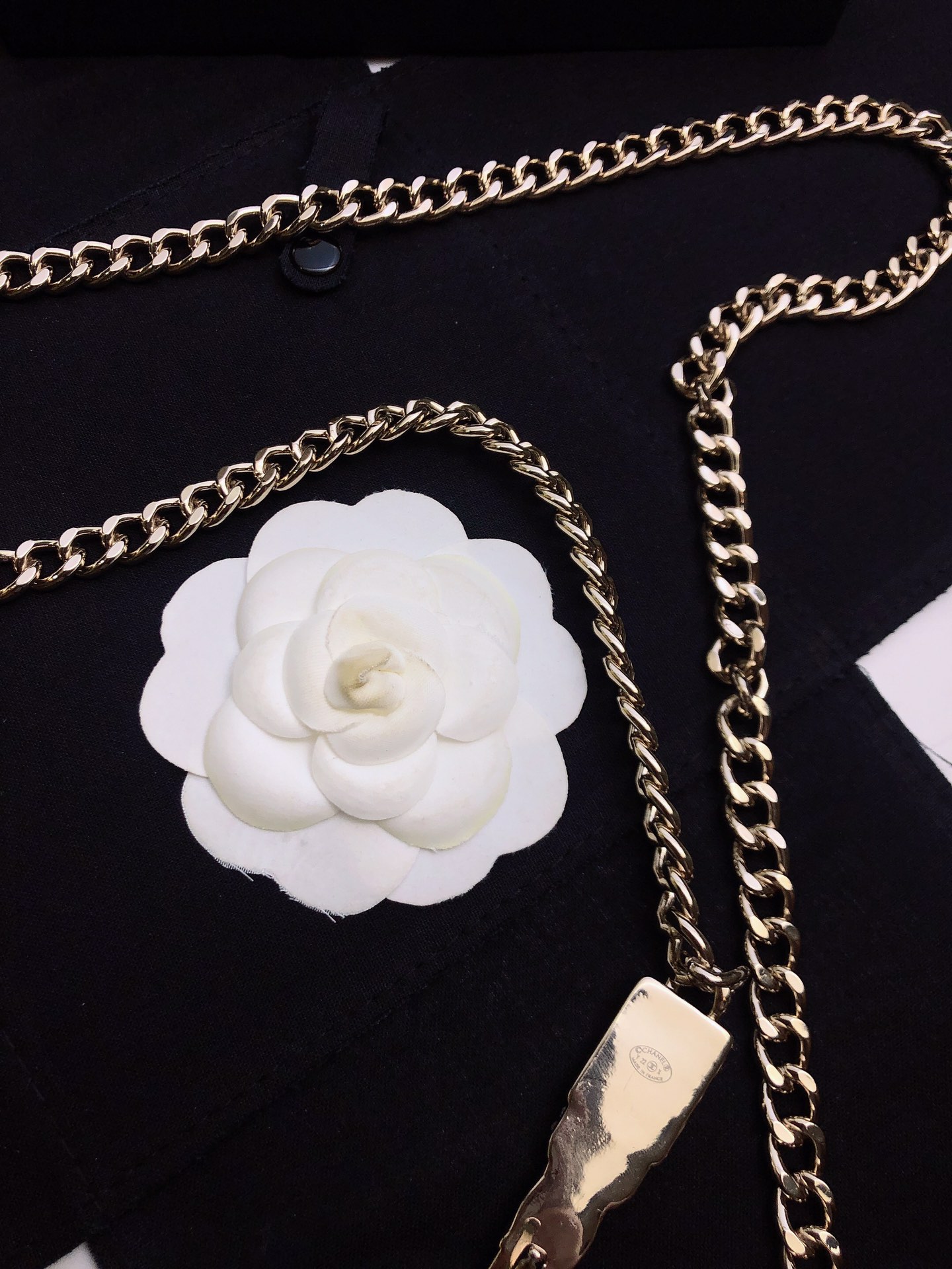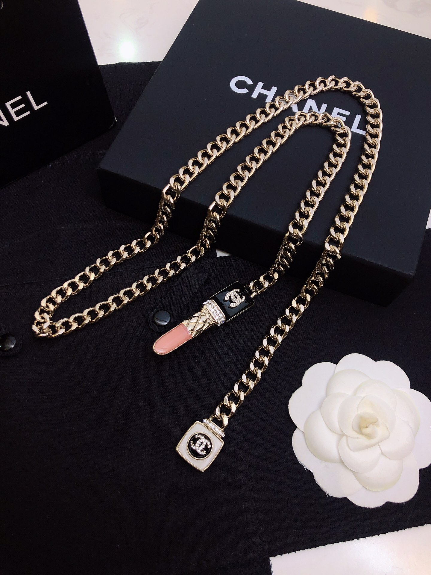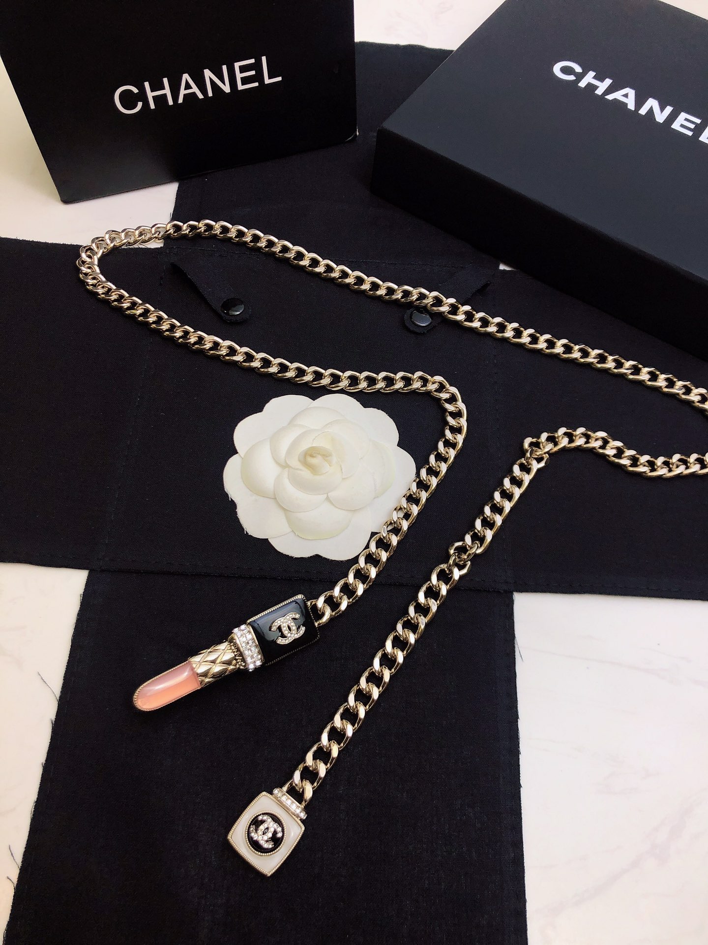 Chanel 新款鏈條腰鏈以金色黃銅材質的鏈條搭配口紅圖案,方塊與口紅有規律的點綴其間。簡約又顯優雅,時尚又顯個性!